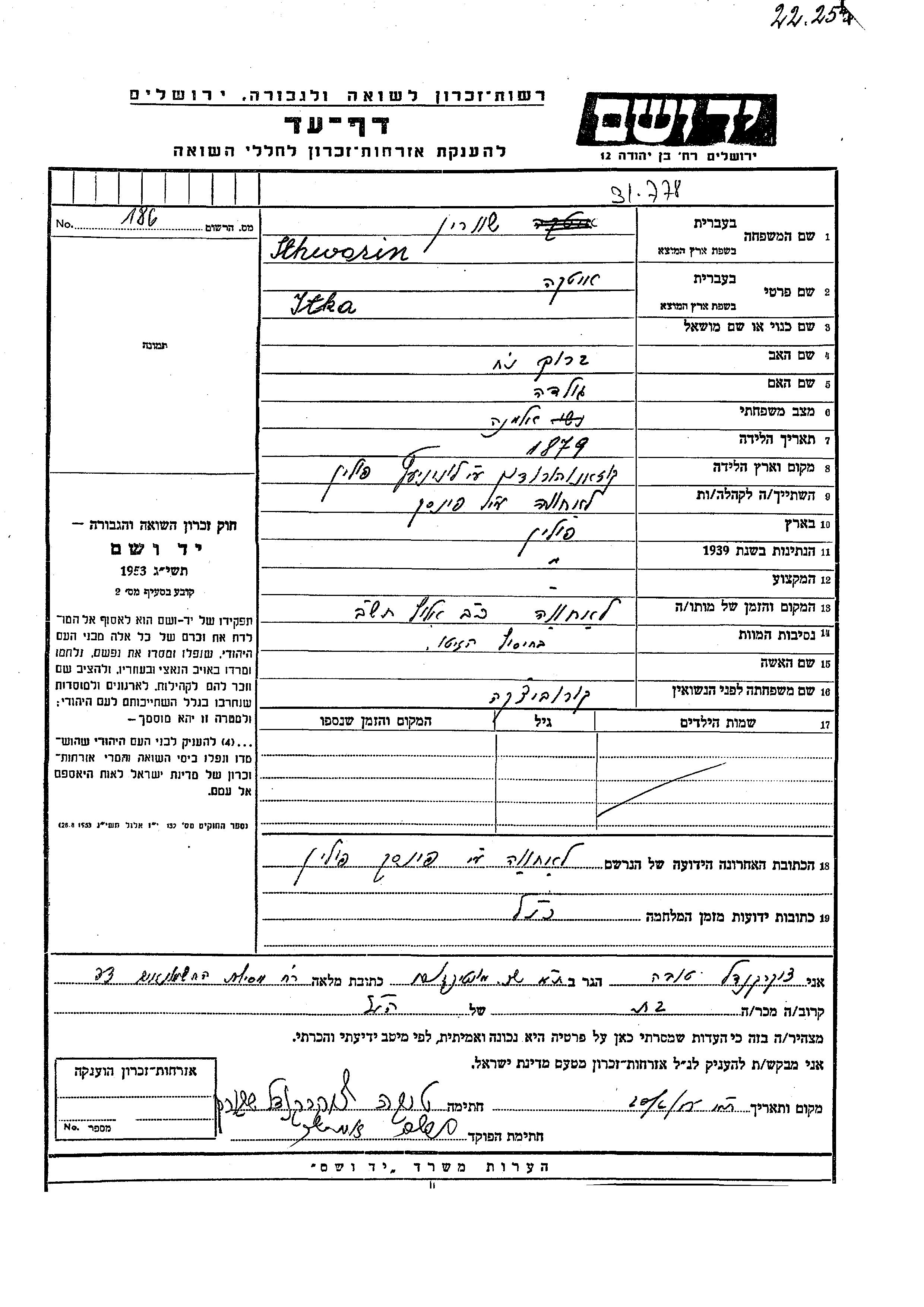 Itka Shvorin, geb. Korobitzka wurde im Jahr 1879 in Kożangródek, Polen geboren. Sie war die Tochter von Barukh Noakh und Golda. Sie war Witwe. Vor dem Zweiten Weltkrieg lebte sie in Lachwa, Polen. Während des Krieges war sie in Lachwa, Polen.