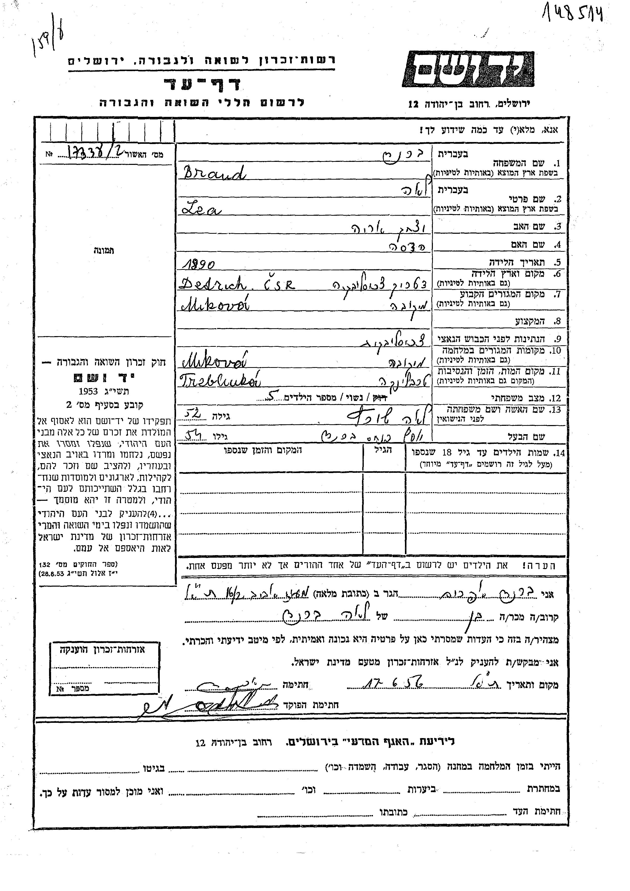 Lea Brand, geb. Shvartz wurde im Jahr 1890 in Detrich, Tschechoslowakei geboren. Sie war die Tochter von Yitzkhak Arie und Hadasa. Sie war mit Yosef Pinkhas Verheiratet. Vor dem Zweiten Weltkrieg lebte sie in Mikova, Tschechoslowakei. Während des Krieges war sie in Mikova, Tschechoslowakei.