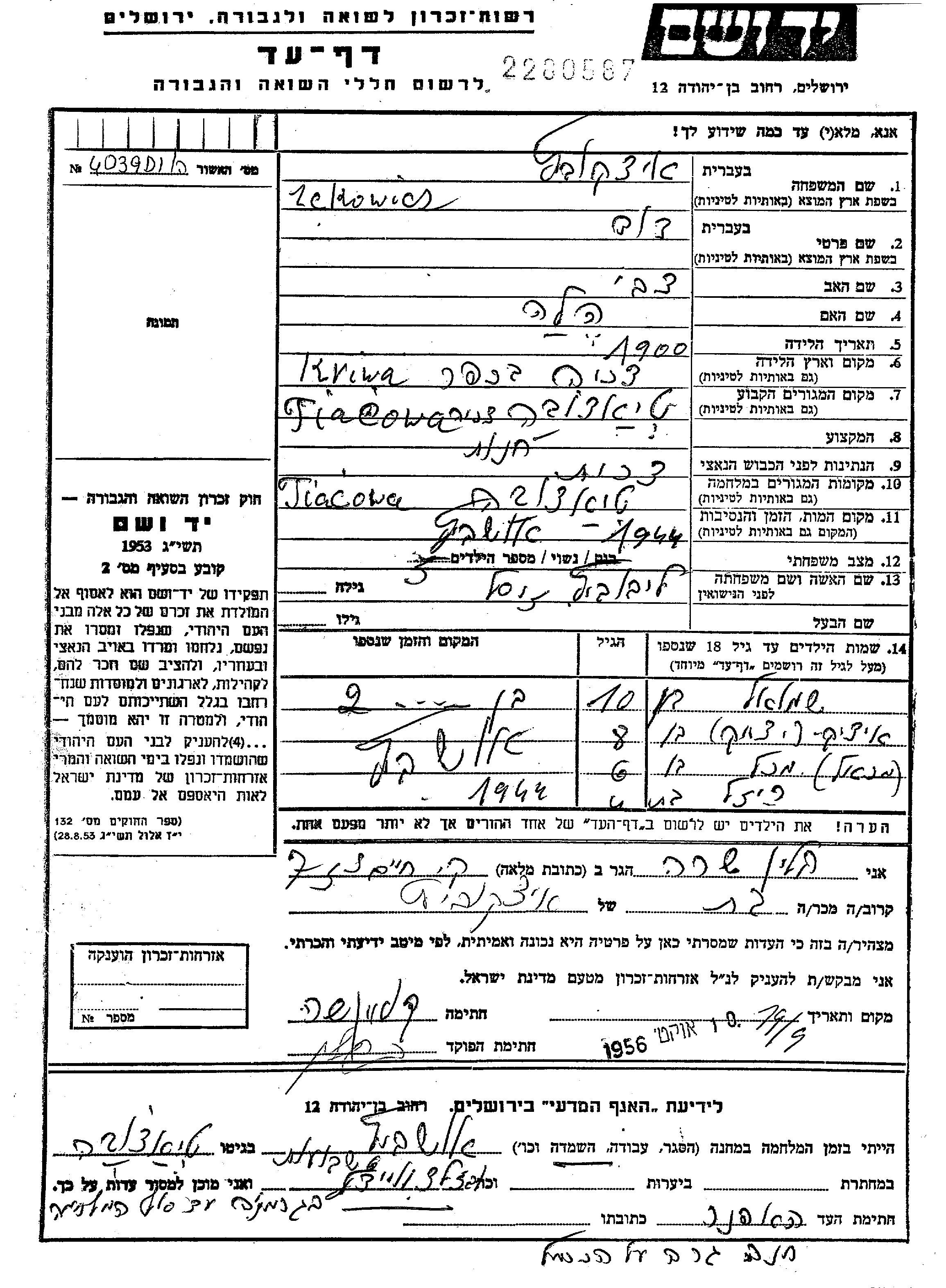 Ickowicz Klein | Sara | Tiacovo, Tschechoslowakei | Gedenkblatt | |