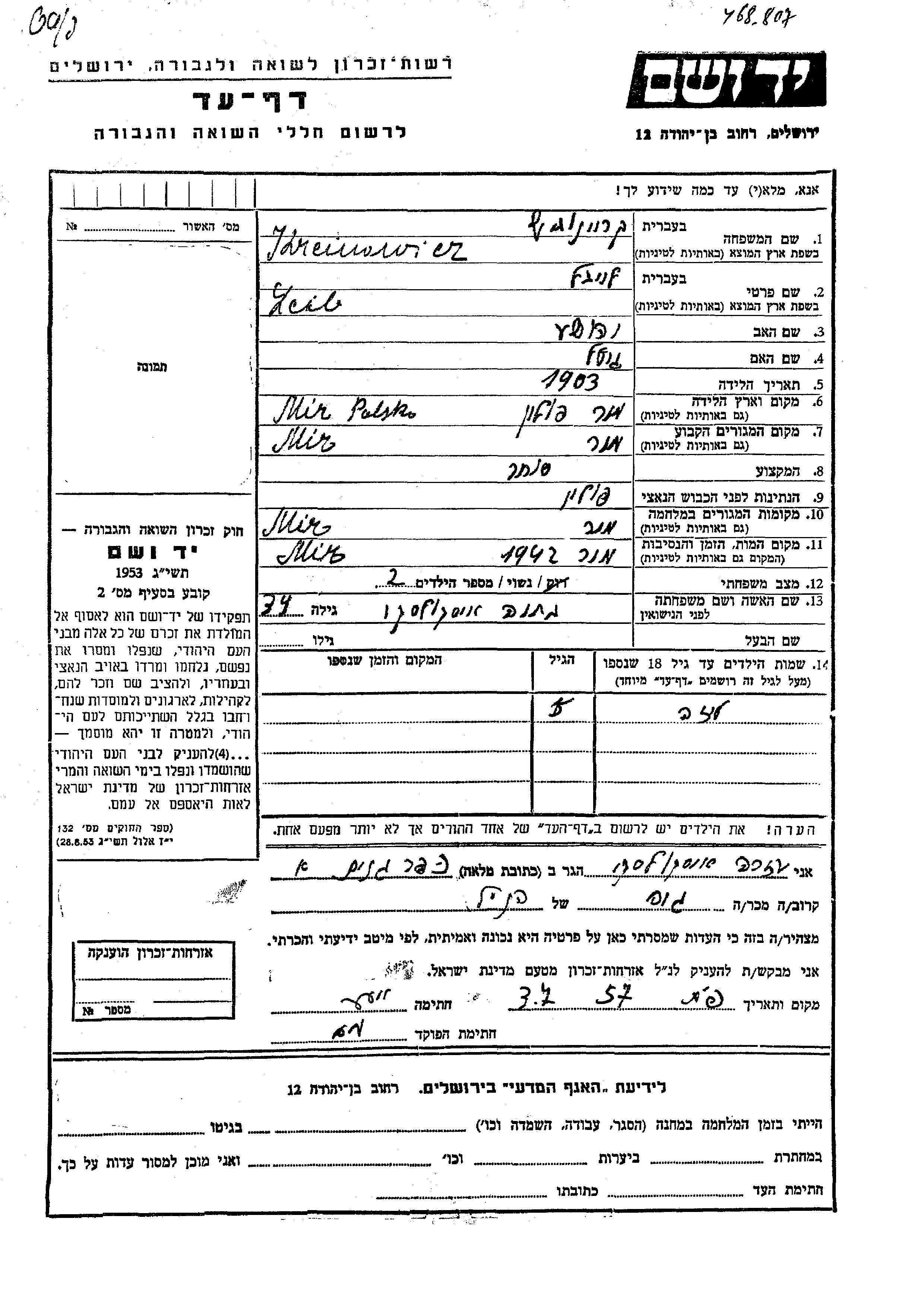Leibel wurde in der Schoah ermordet. Todesort: Mir, Polen im Jahr 1942.