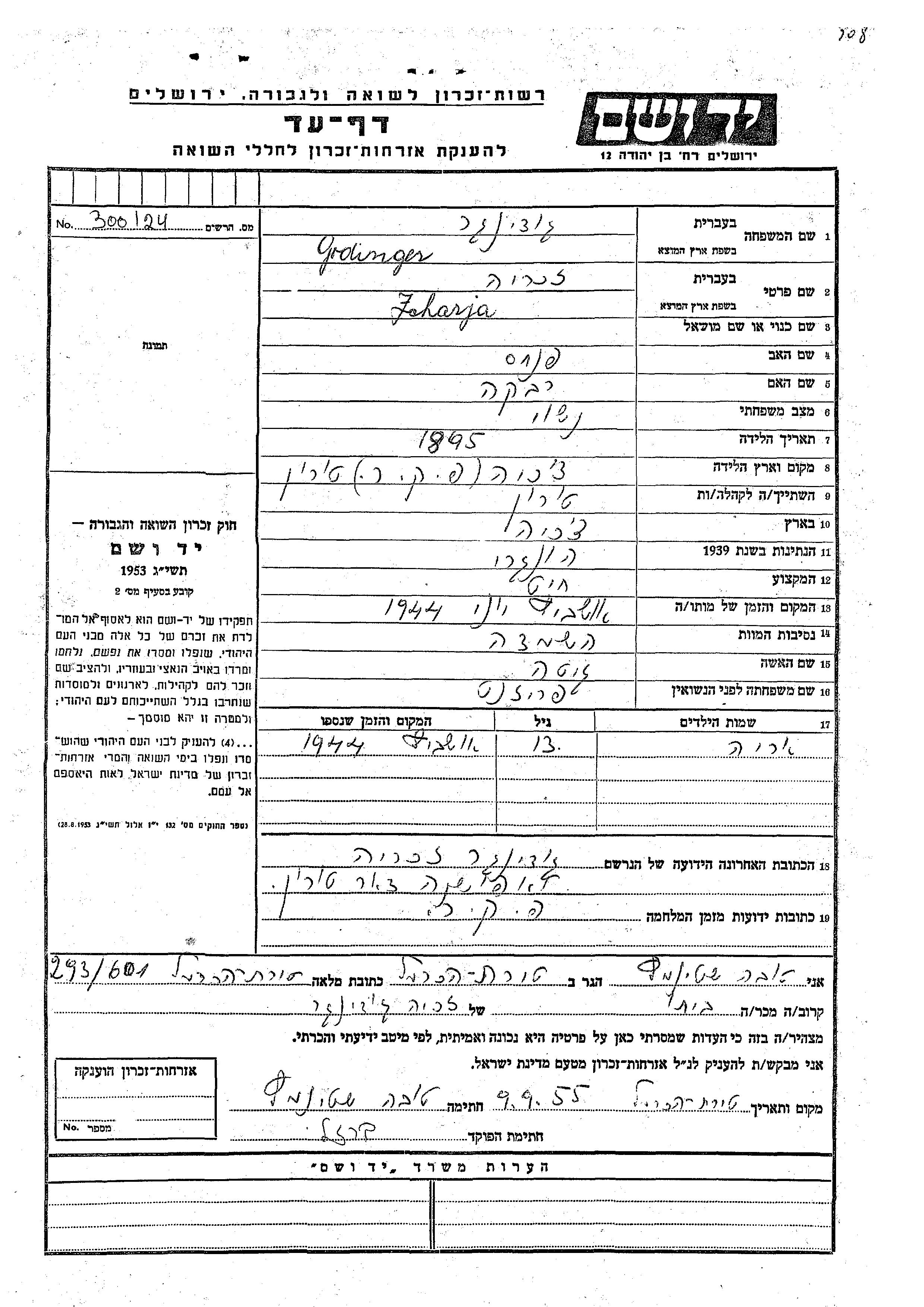 Zaharja Godinger wurde im Jahr 1895 in Torun, Tschechoslowakei geboren. Er war der Sohn von Pinkhas und Rivka. Er war Schneider und mit Gita, geb. Prizant Verheiratet. Vor dem Zweiten Weltkrieg lebte er in Torun, Tschechoslowakei. Während des Krieges war er in Carpathian Ruthenia, Tschechoslowakei.
