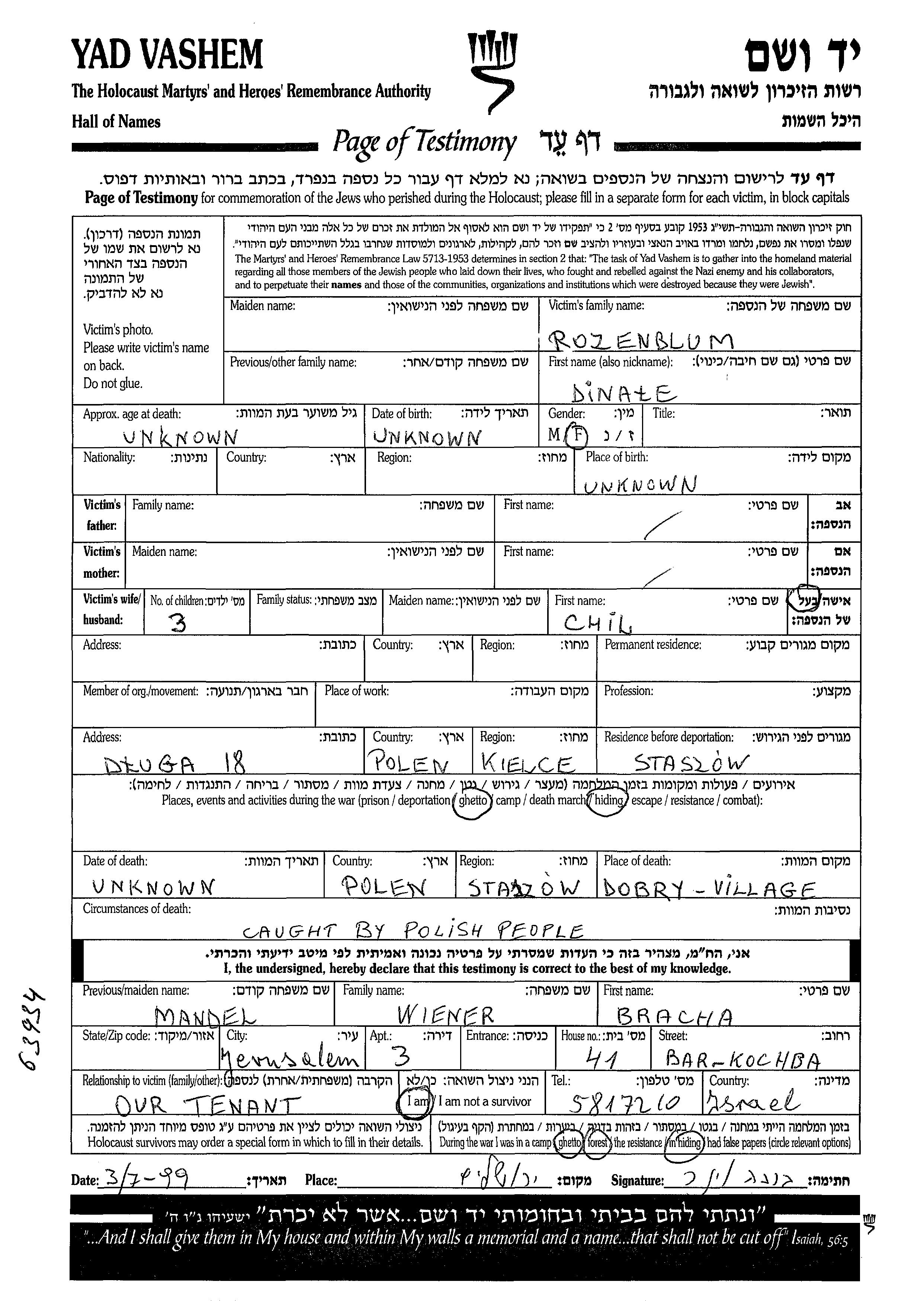 Dina Rozenblum, geb. Szperling wurde in Bozentyn, Polen geboren. Vor dem Zweiten Weltkrieg lebte sie in Sztasiew, Polen.