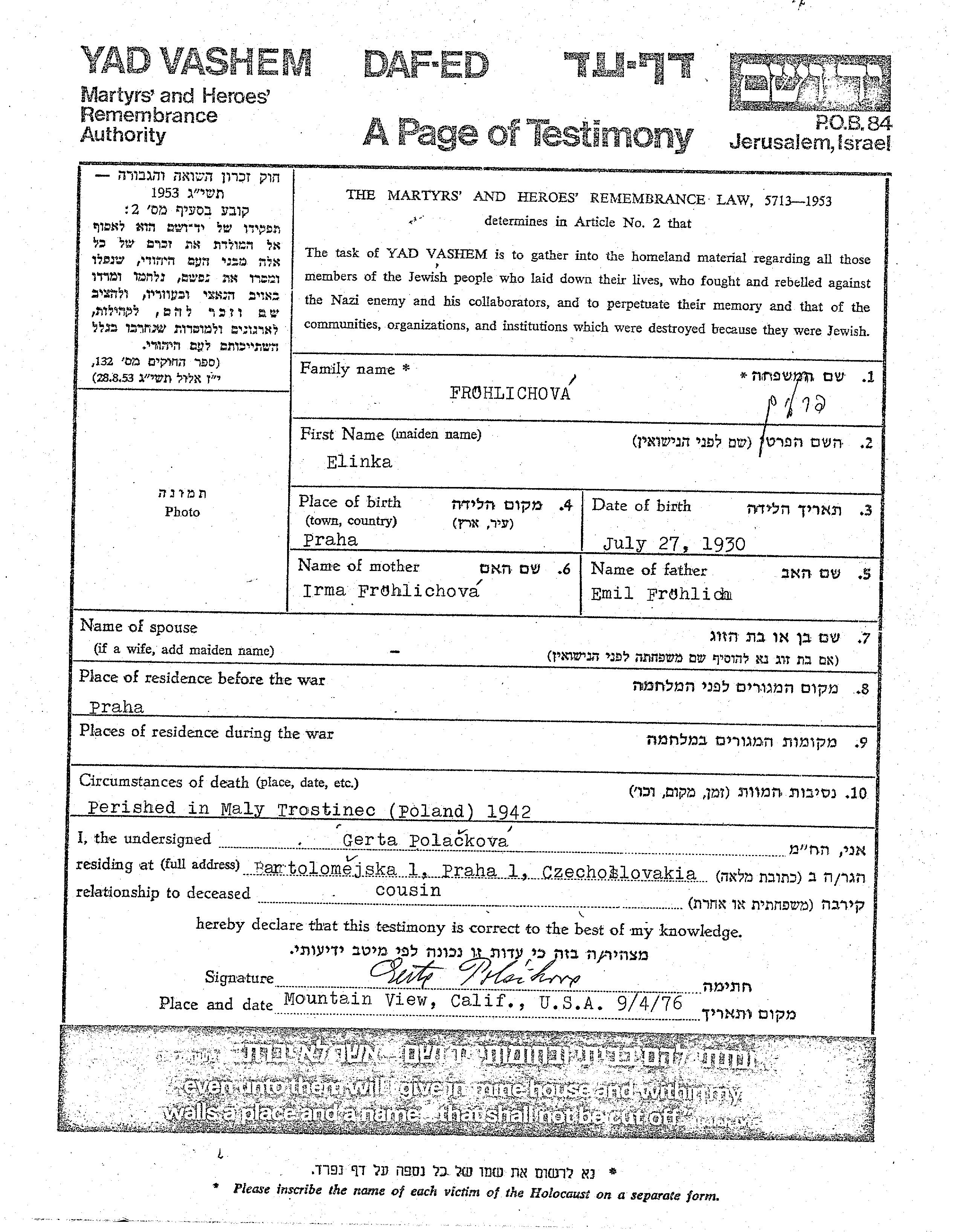Elinka Frohlichova wurde im Jahr 1930 in Praha, Tschechoslowakei geboren. Er/sie war der/ die Sohn/Tochter von Emil und Irma. Vor dem Zweiten Weltkrieg er/sie in Praha, Tschechoslowakei.
