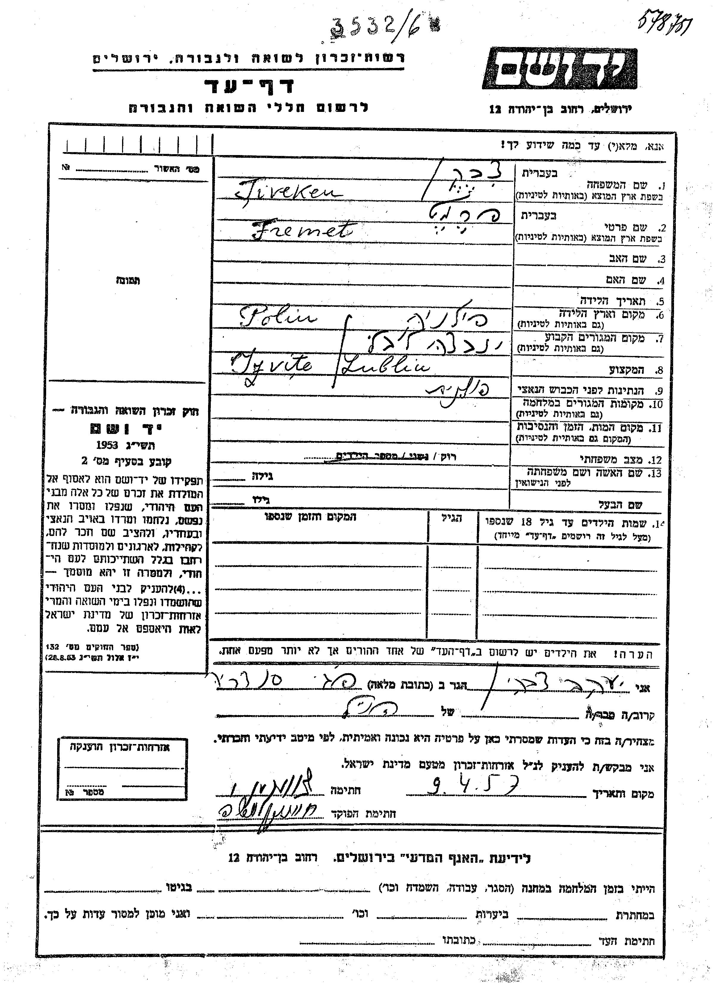 Fremet Tiveken wurde in Polen geboren. Sie war Ledig. Vor dem Zweiten Weltkrieg lebte sie in Izbica, Polen.