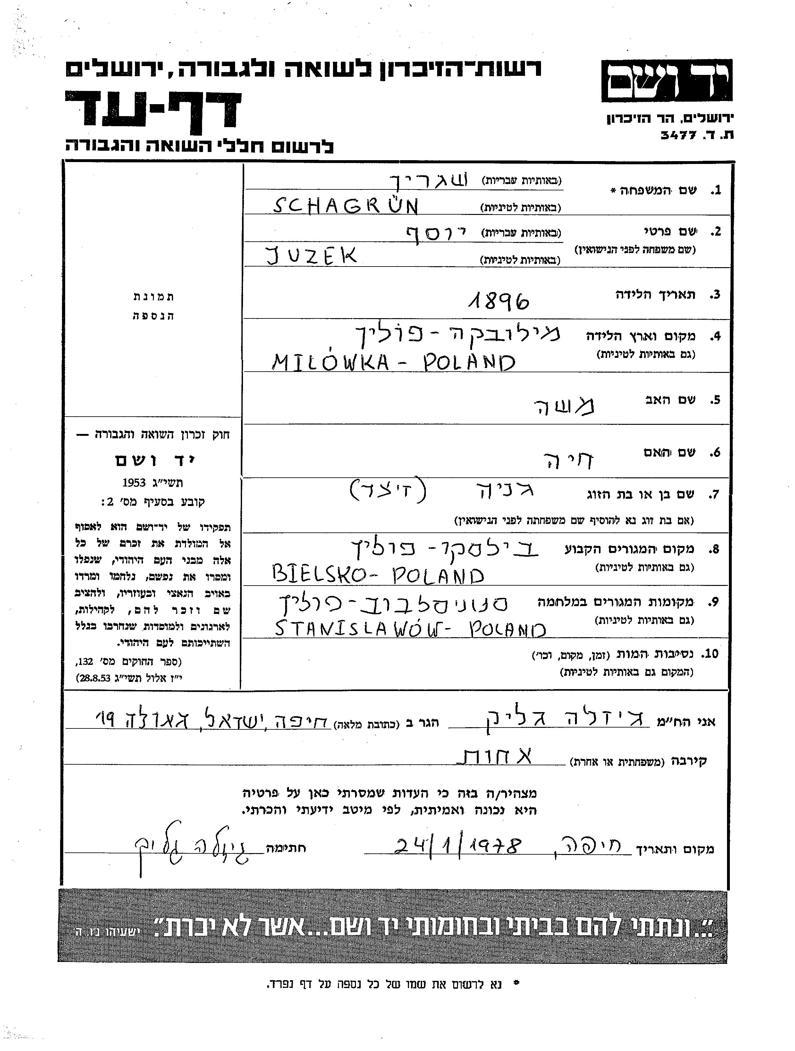 Yuzek Schagruen wurde im Jahr 1896 in Milowka, Polen geboren. Er war der Sohn von Moshe und Khaia. Er war mit Genya, geb. Zitzer Verheiratet. Vor dem Zweiten Weltkrieg lebte er in Bielsko, Polen. Während des Krieges war er in Stanislawow, Polen.