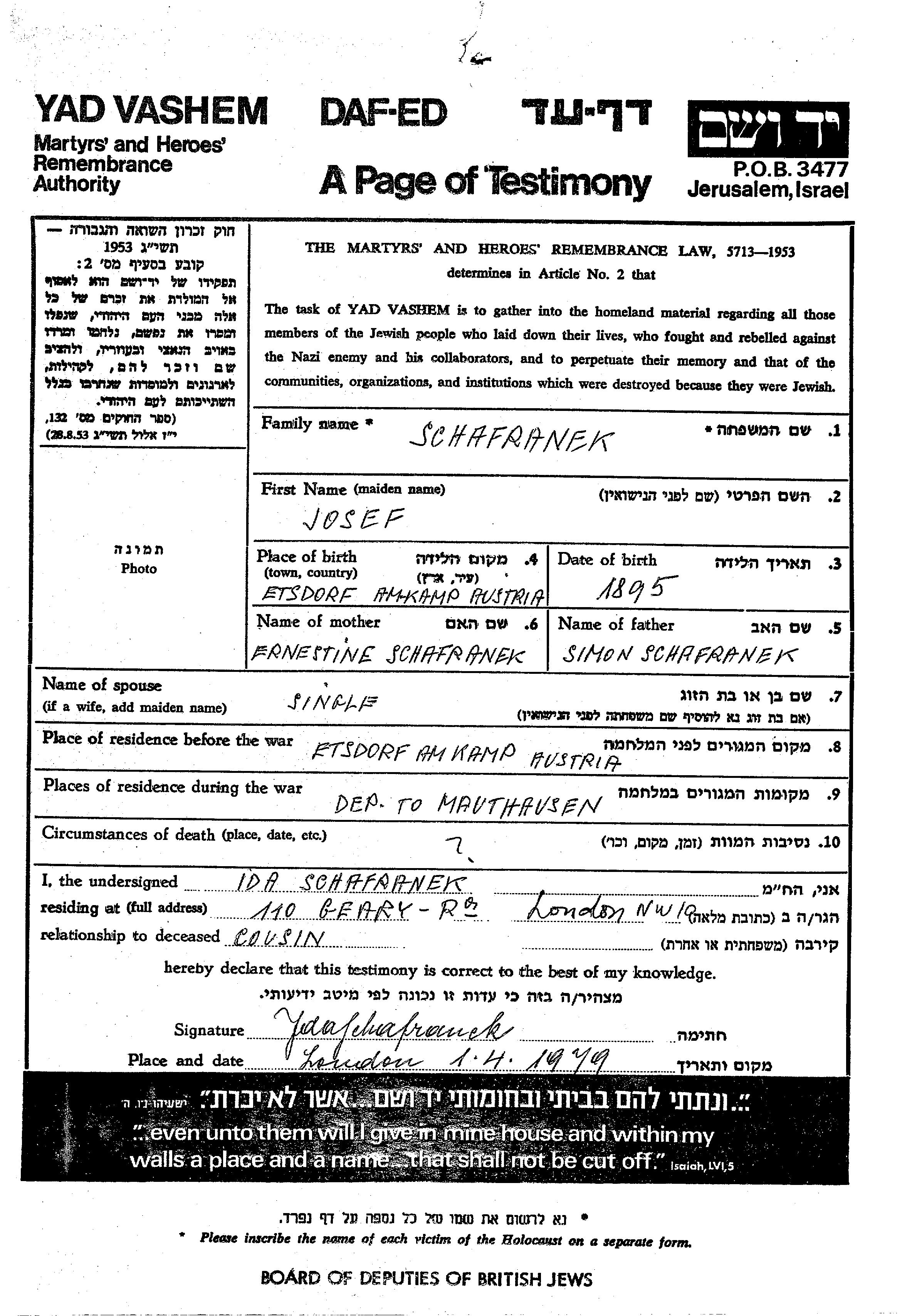 Josef Schafranek wurde im Jahr 1895 in Etsdorf am Kamp, Österreich geboren. Er war der Sohn von Simon und Ernestine. Er war Ledig. Vor dem Zweiten Weltkrieg lebte er in Etsdorf am Kamp, Österreich. Während des Krieges war er in Mauthausen, Österreich.