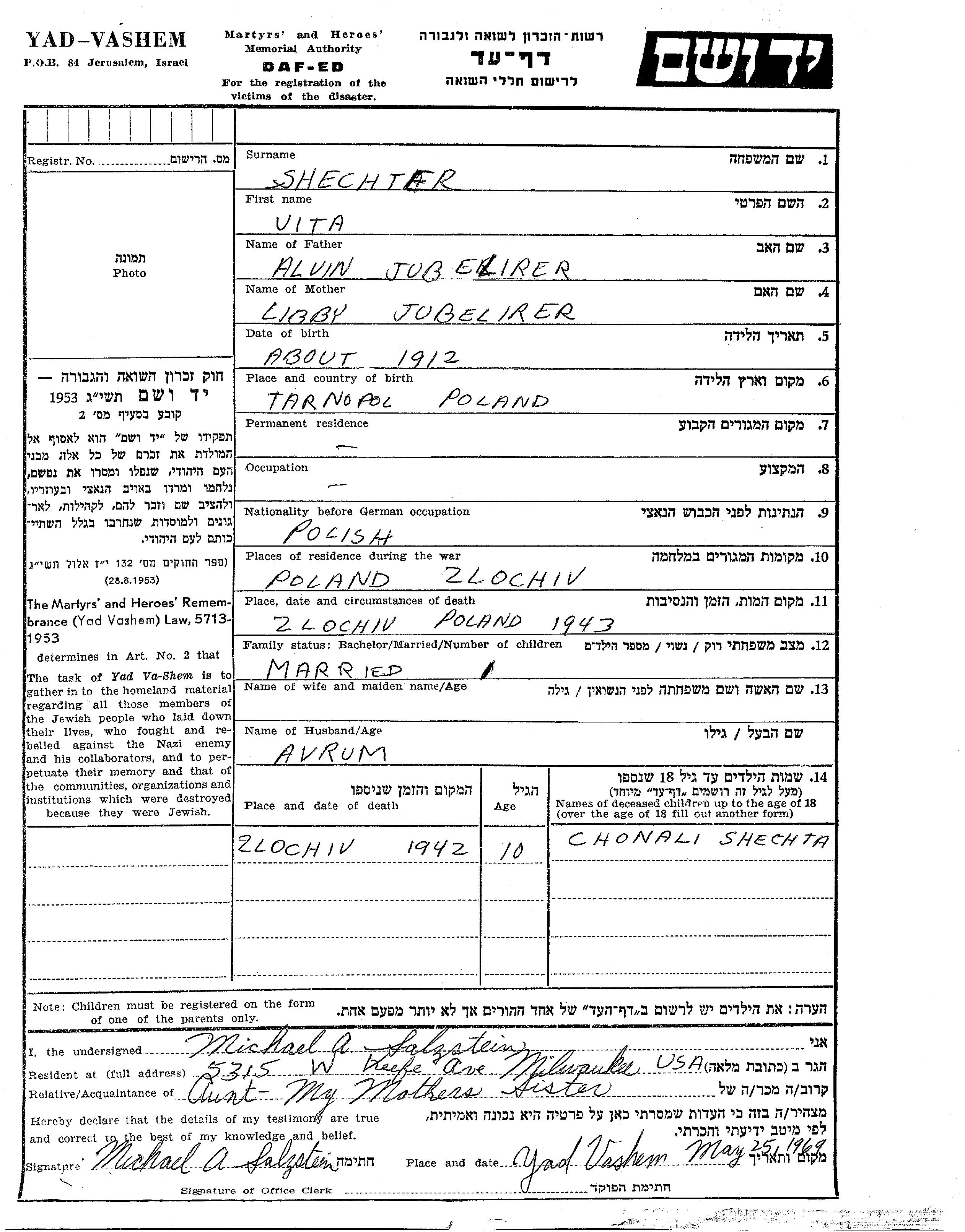 Vita Shechter, geb. Jubelirer wurde im Jahr 1912 in Tarnopol, Polen geboren. Sie war die Tochter von Alvin und Libby. Sie war mit Avrum Verheiratet. Während des Krieges war sie in Polen.