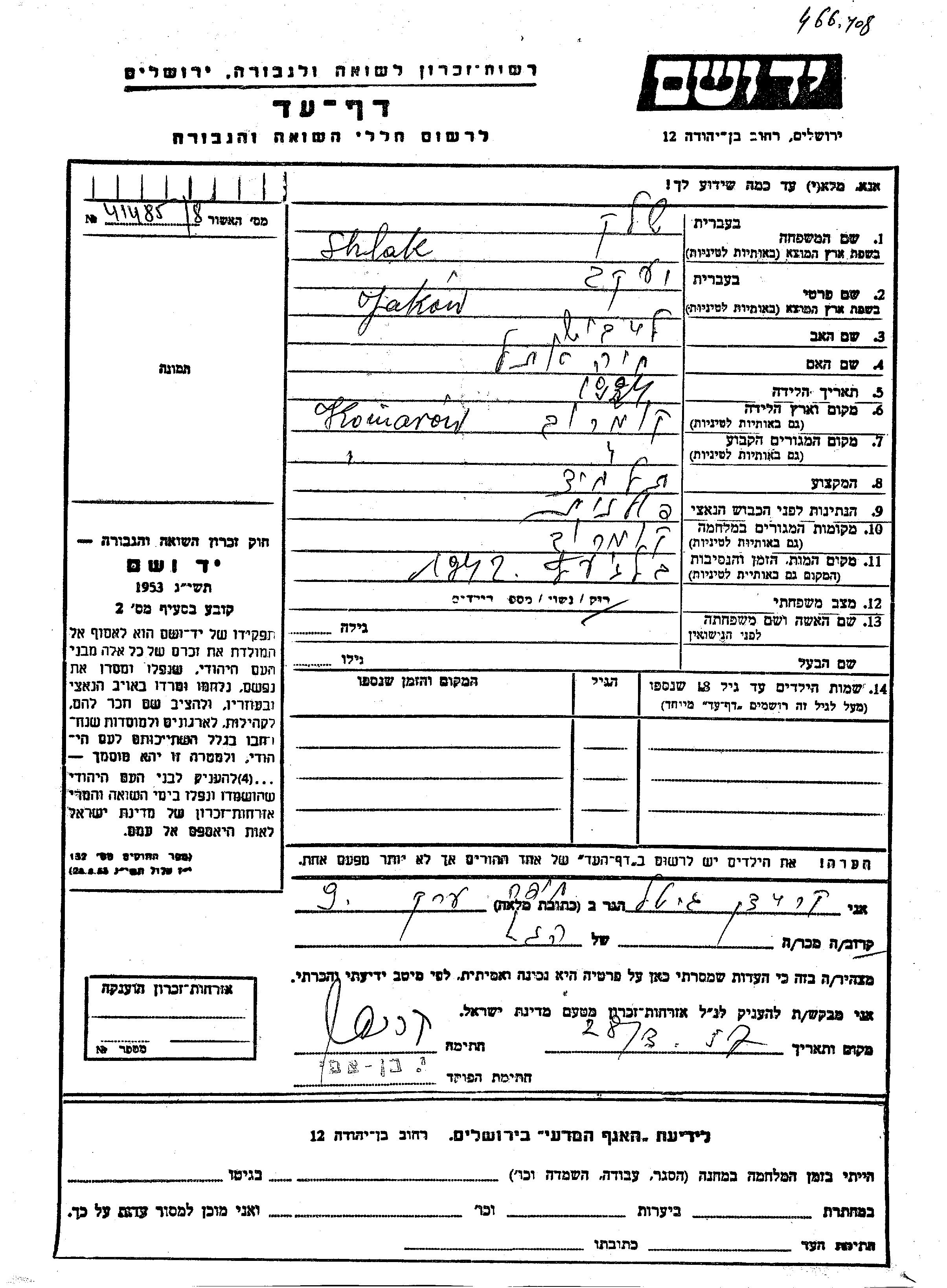 Jakow Shlak wurde im Jahr 1934 in Komarow, Polen geboren. Er war der Sohn von Leibish und Khaia Etel. Er war Schüler/-in und Ledig. Vor dem Zweiten Weltkrieg lebte er in Komarow, Polen. Während des Krieges war er in Komarow, Polen.