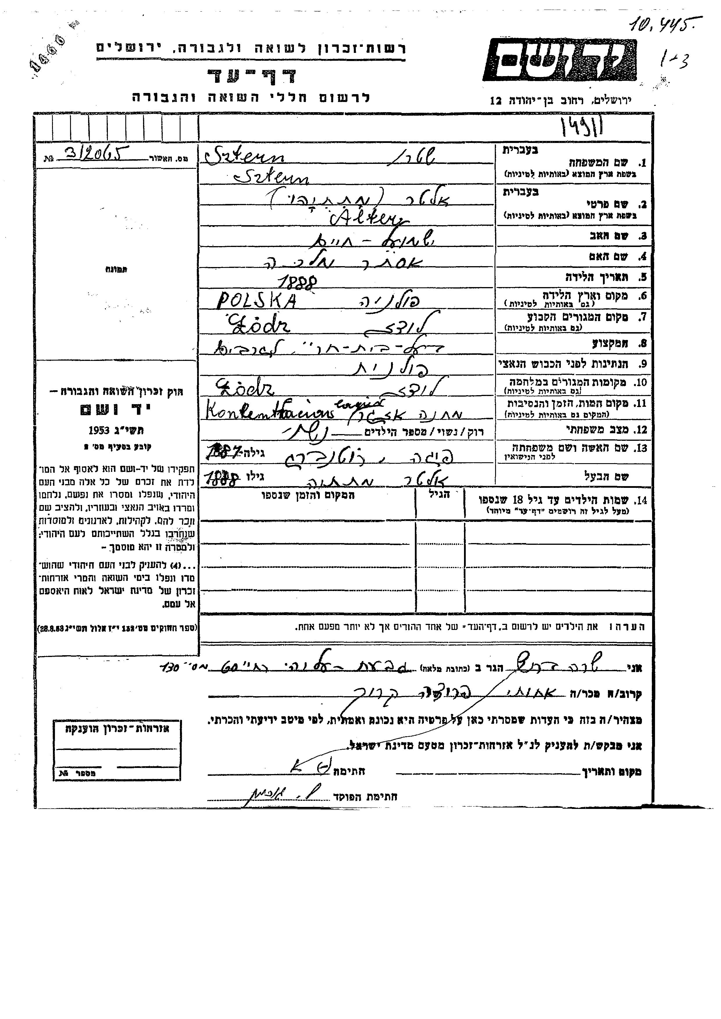 Alter Matatiahu Sztern wurde im Jahr 1888 in Polen geboren. Er war der Sohn von Shmuel Khaim und Ester Malka. Er war Besitzer einer strumpffabrik und mit Feiga, geb. Rutenberg Verheiratet. Vor dem Zweiten Weltkrieg lebte er in Lodz, Polen. Während des Krieges war er in Lodz, Polen.