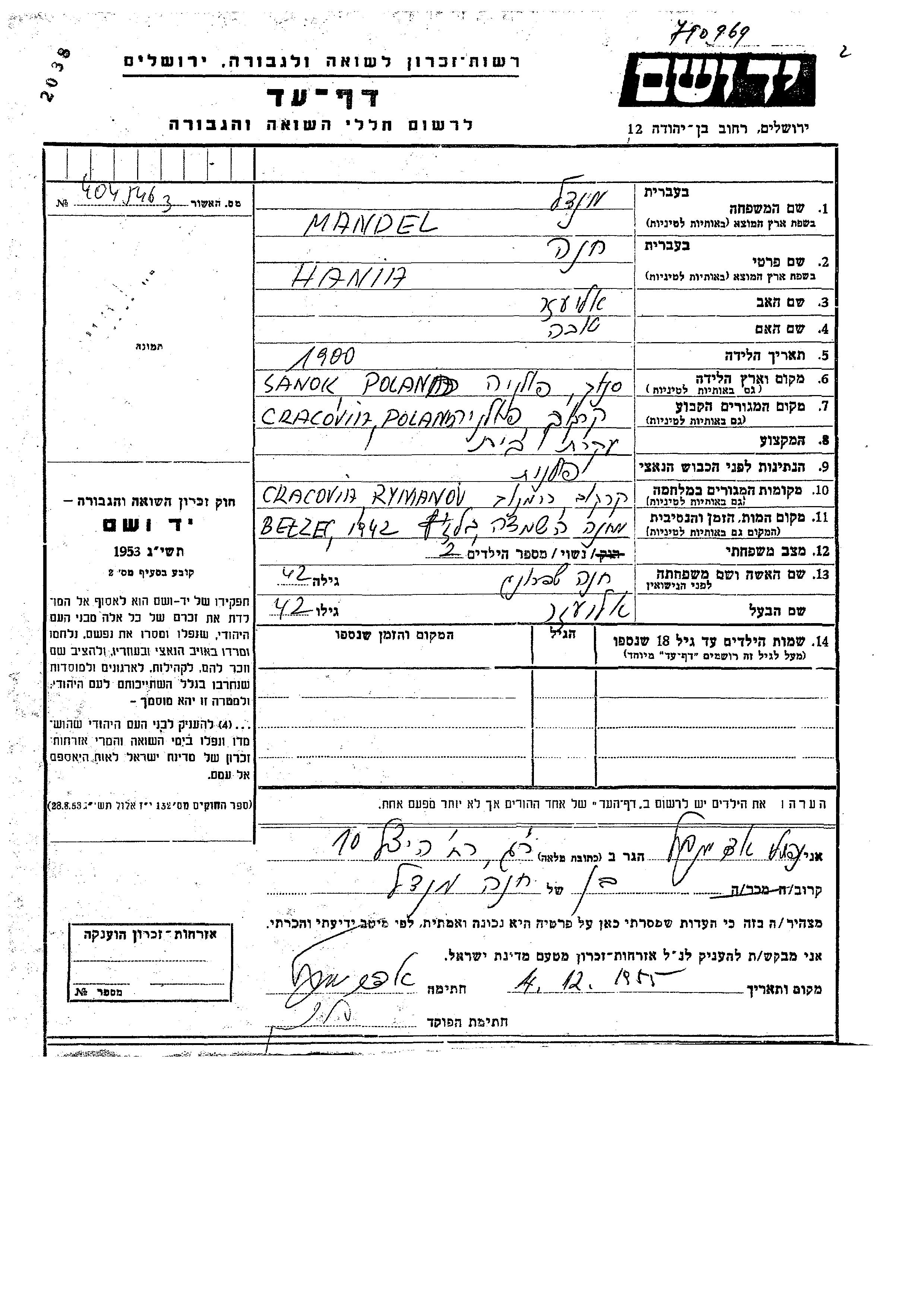 Hania Mandel, geb. Shprung wurde im Jahr 1900 in Sanok, Polen geboren. Sie war die Tochter von Eliezer und Tova. Sie war Hausfrau und mit Eliezer Verheiratet. Vor dem Zweiten Weltkrieg lebte sie in Cracovie, Polen. Während des Krieges war sie in Cracovie, Polen.