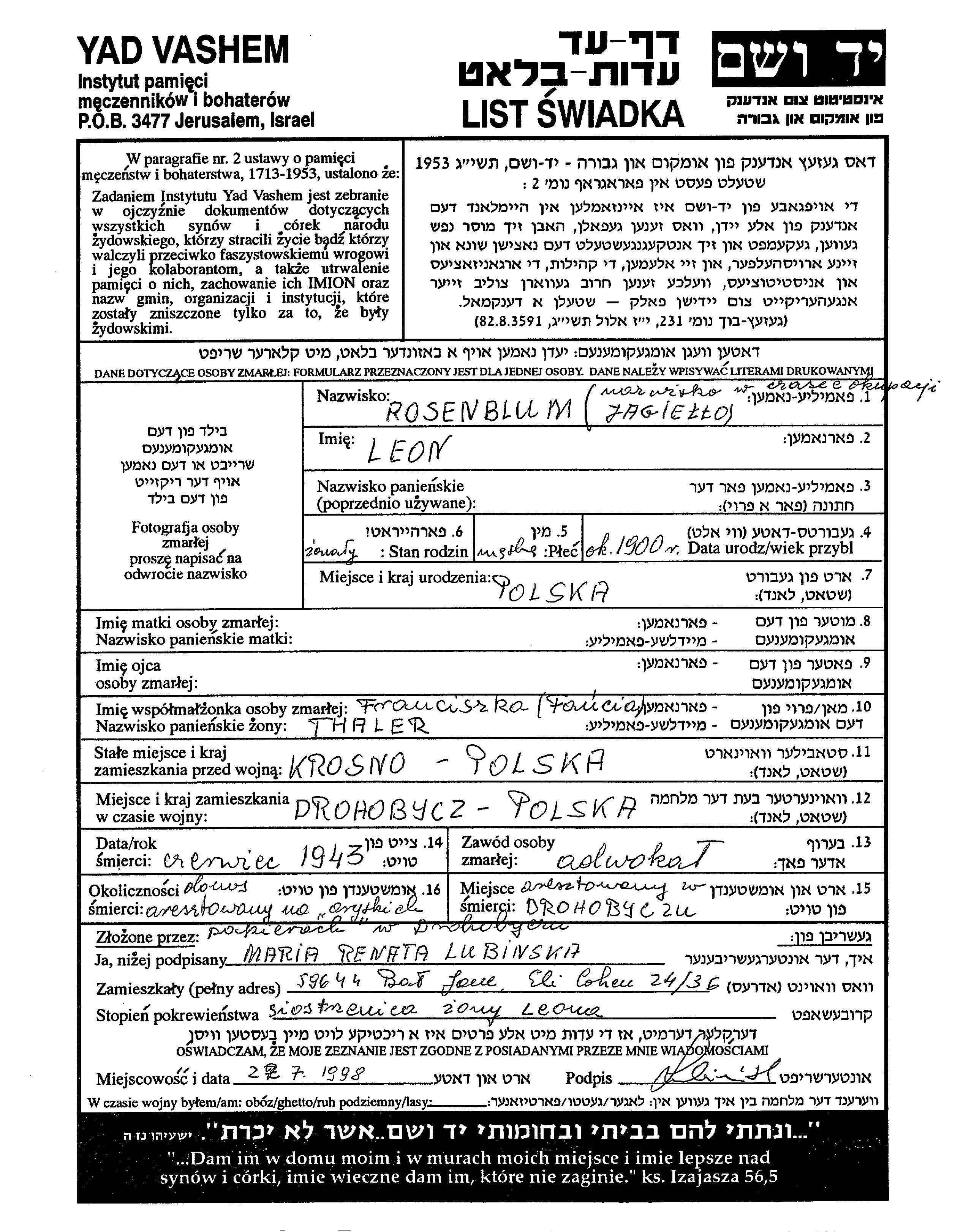 Leon Rosenblum wurde im Jahr 1900 in Polen geboren. Vor dem Zweiten Weltkrieg lebte er in Krosno, Polen. Während des Krieges war er in Drohobycz, Polen.