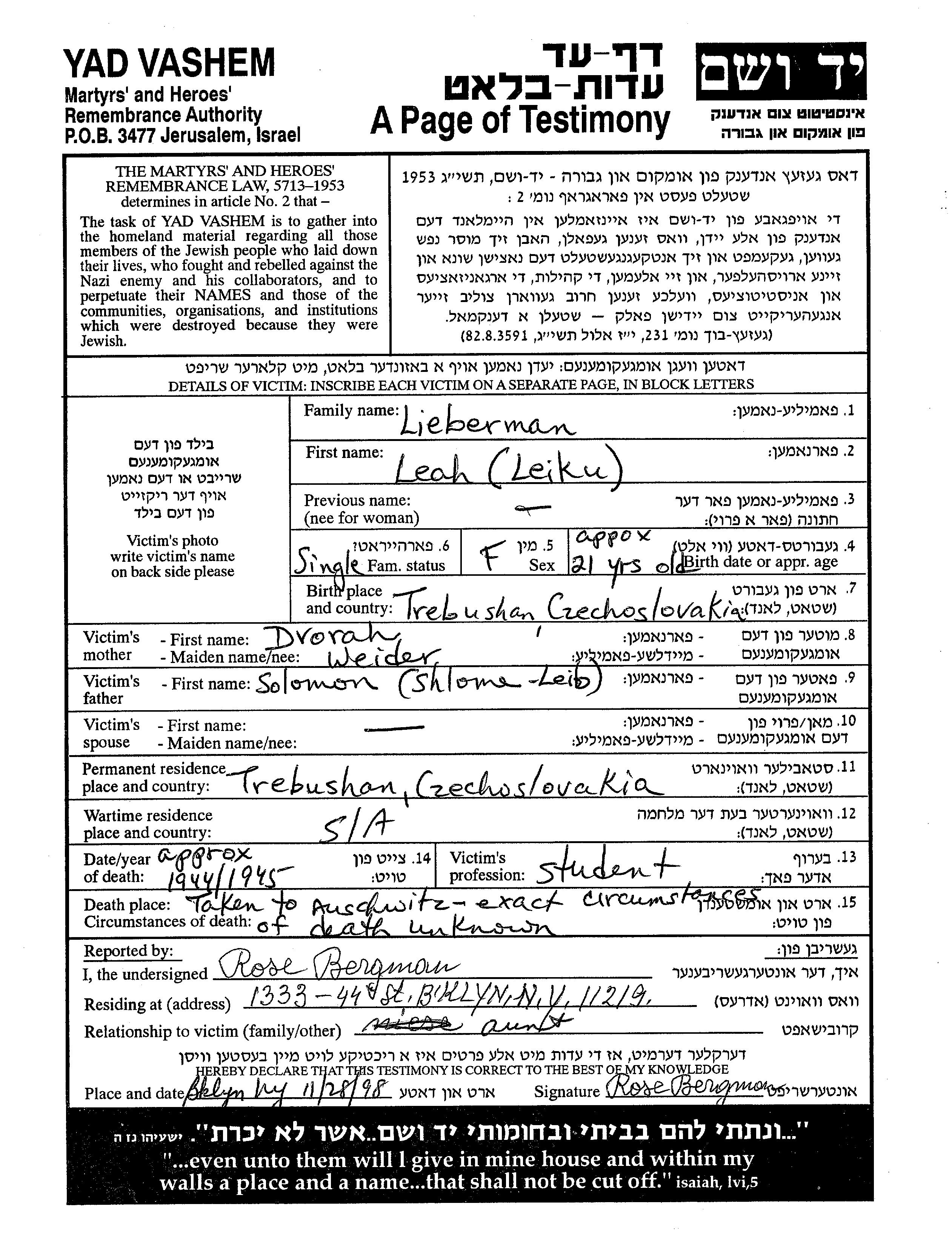 Leah Lieberman wurde in Trebuszyn, Tschechoslowakei geboren. Sie war die Tochter von Solomon Leib und Dvorah. Sie war Student und Ledig. Vor dem Zweiten Weltkrieg lebte sie in Trebuszyn, Tschechoslowakei. Während des Krieges war sie in Trebuszyn, Tschechoslowakei.