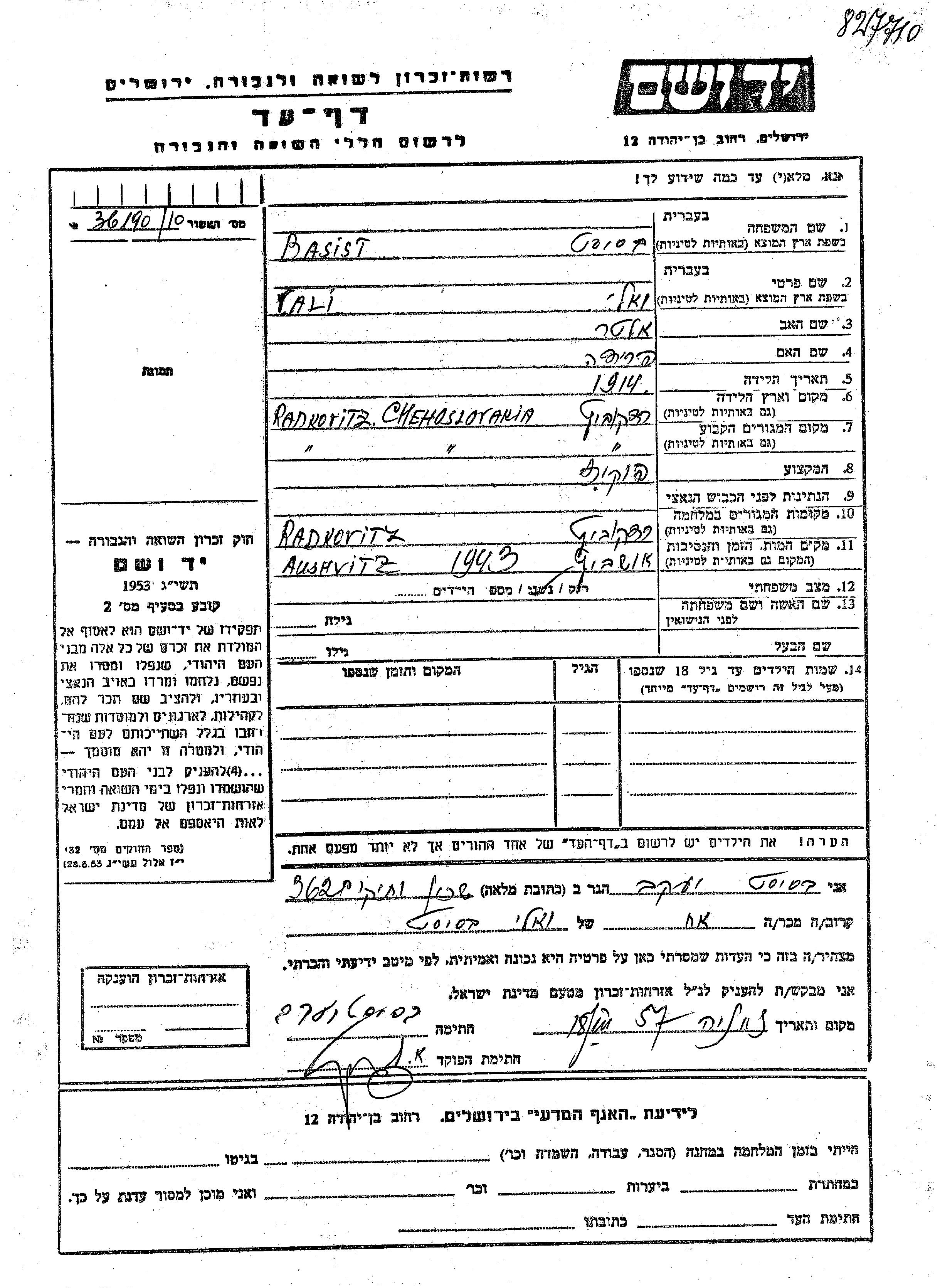 Vali Basist wurde im Jahr 1914 in Radkovice, Tschechoslowakei geboren. Sie war die Tochter von Alter und Frida. Sie war Angestellte/-r und Ledig. Vor dem Zweiten Weltkrieg lebte sie in Radkovice, Tschechoslowakei. Während des Krieges war sie in Radkovice, Tschechoslowakei.