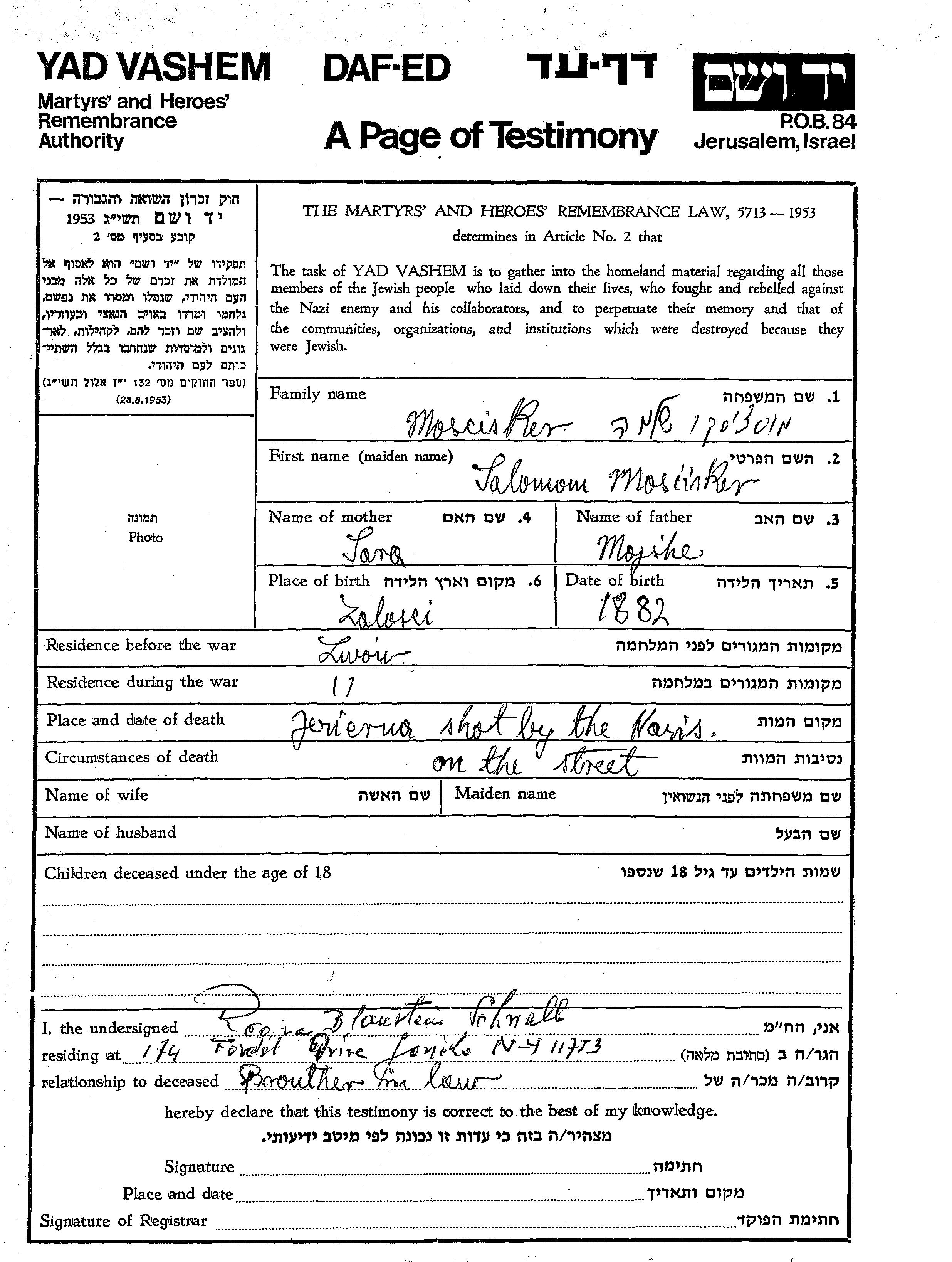Salomon Moscisker wurde im Jahr 1882 in Eastern Galicia, Polen geboren. Er war der Sohn von Mojshe und Sara. Vor dem Zweiten Weltkrieg lebte er in Lwow, Polen. Während des Krieges war er in Lwow, Polen.