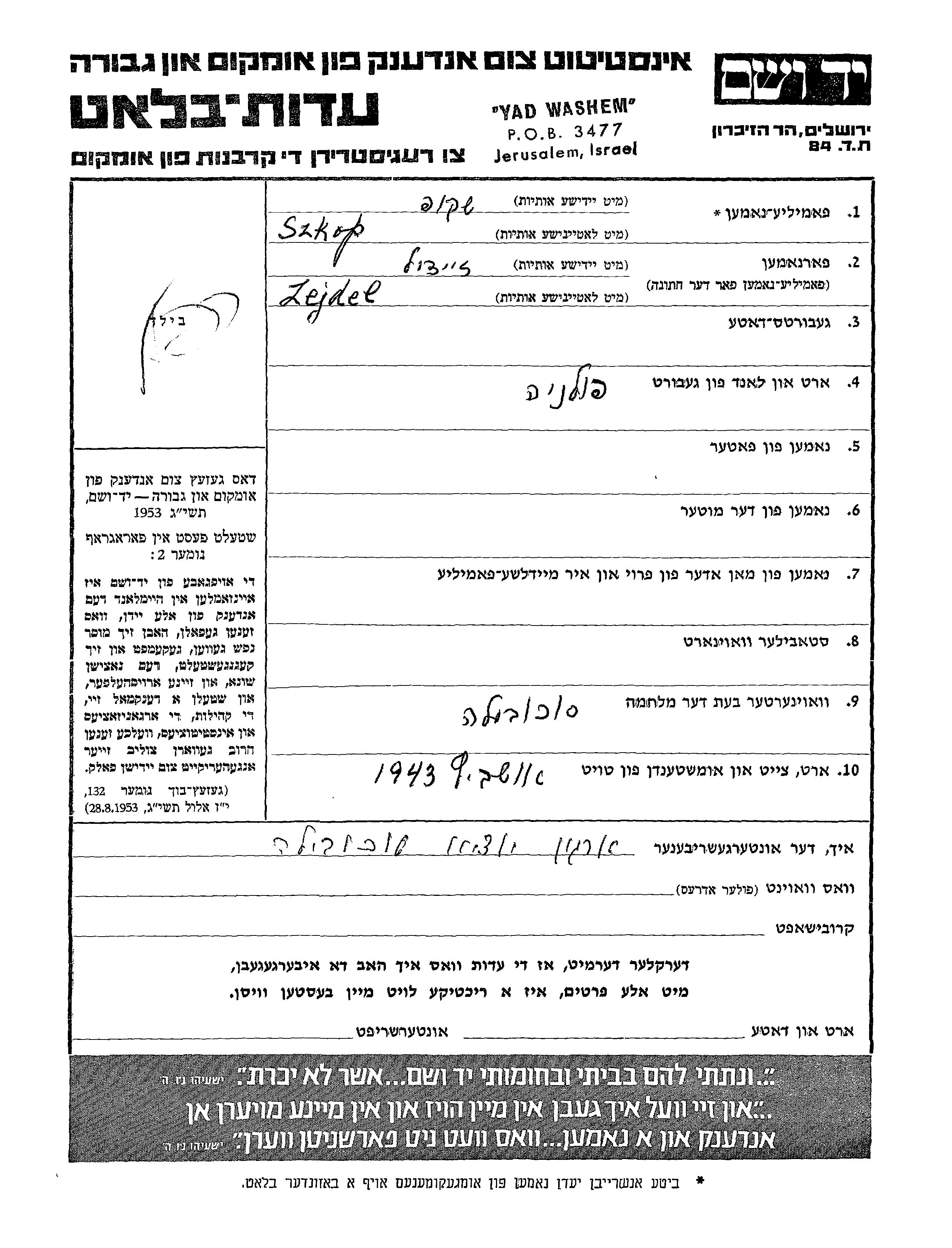 Zejdel Szkop wurde in Polen geboren. Während des Krieges war er in Suchowola, Polen.