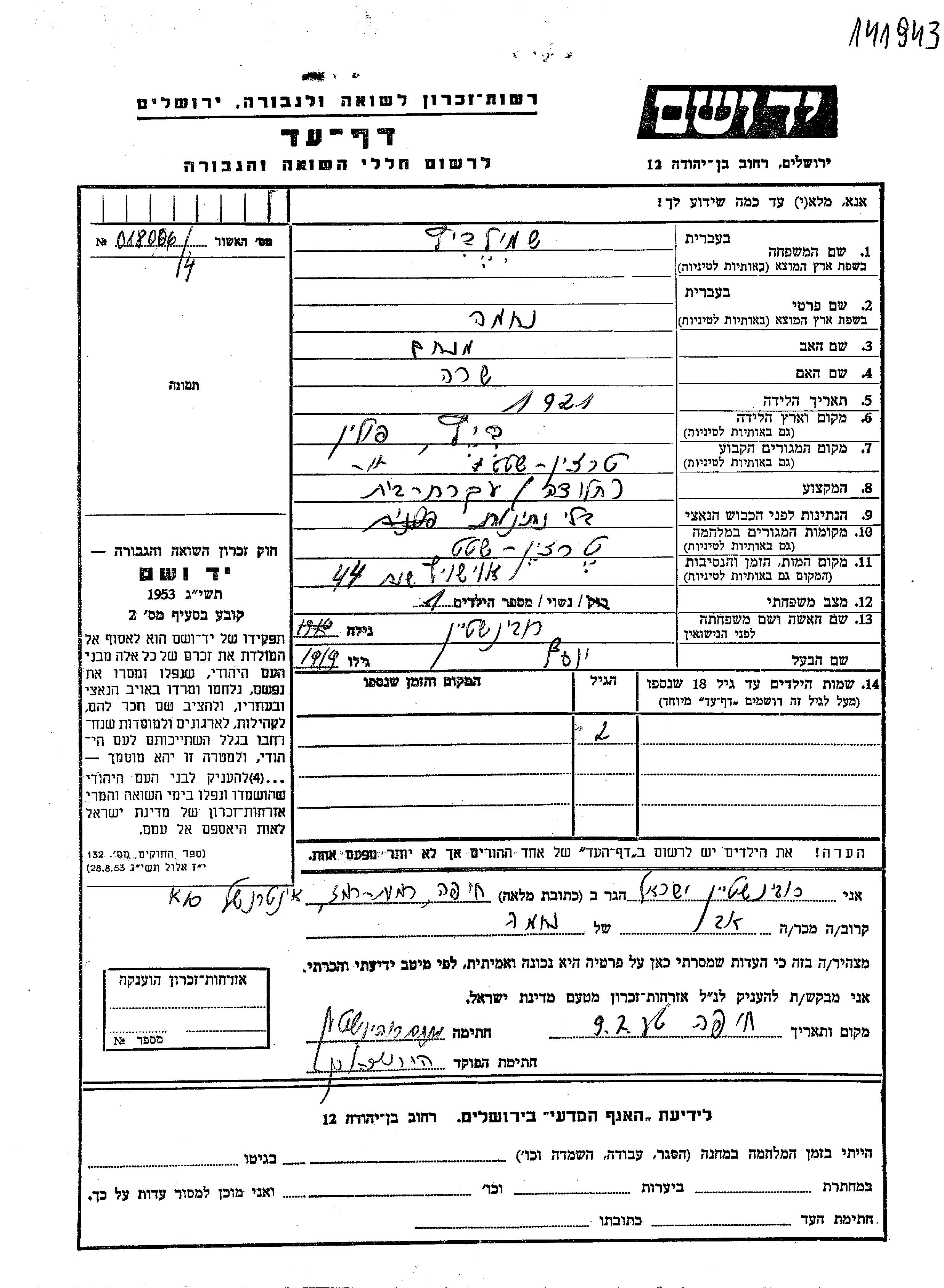 Nekhama Shmilevitz, geb. Rubinshtein wurde im Jahr 1921 in Biecz, Polen geboren. Sie war die Tochter von Menakhem und Sara. Sie war Hausfrau und mit Yosef Verheiratet. Vor dem Zweiten Weltkrieg lebte sie in Theresienstadt, Tschechoslowakei. Während des Krieges war sie in Theresienstadt, Tschechoslowakei.