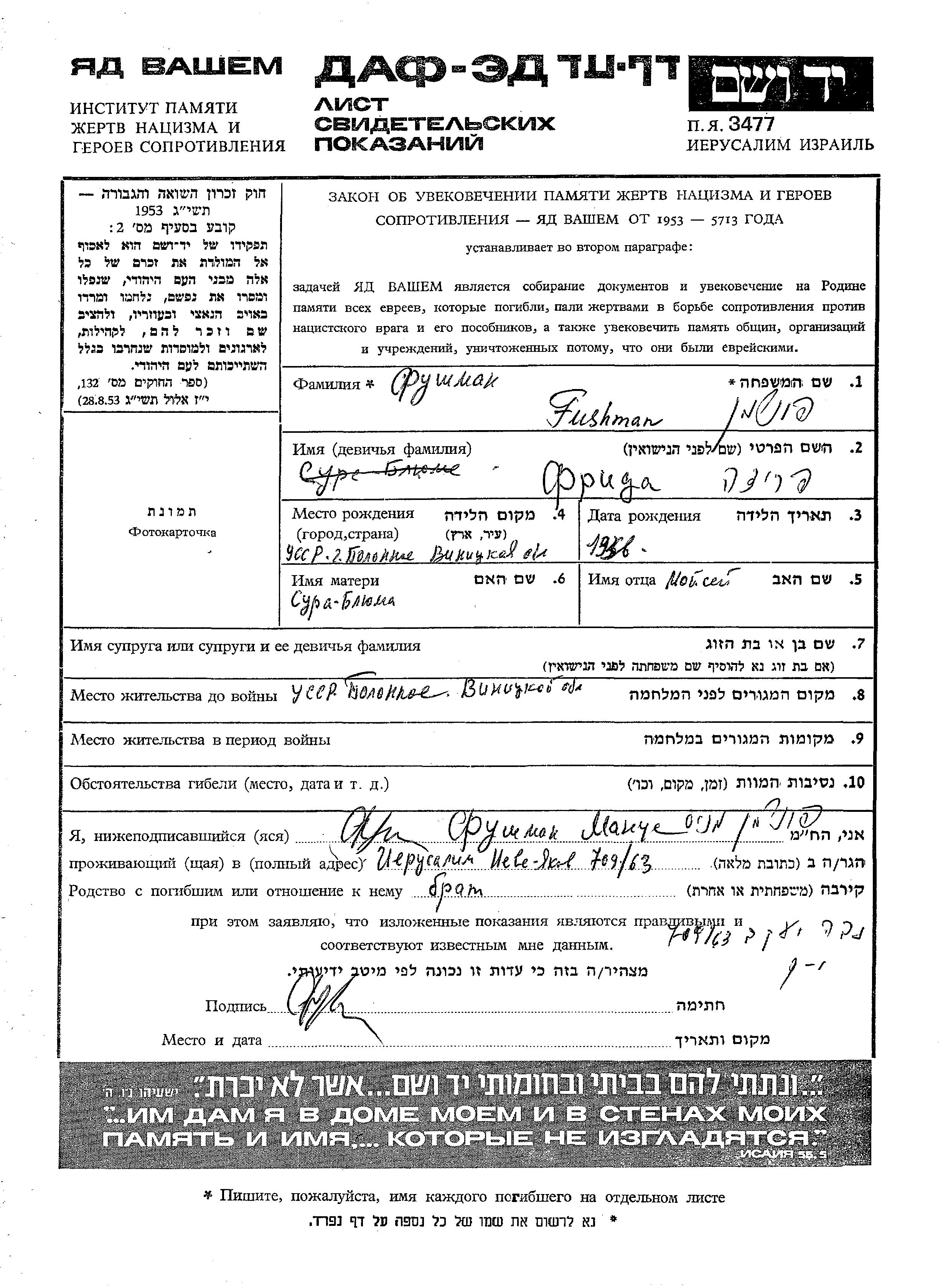 Frida Fushman wurde im Jahr 1936 in Polonnoye, Ukraine (UdSSR) geboren. Sie war die Tochter von Moisei und Sura Bluma. Vor dem Zweiten Weltkrieg lebte sie in Polonnoye, Ukraine (UdSSR).