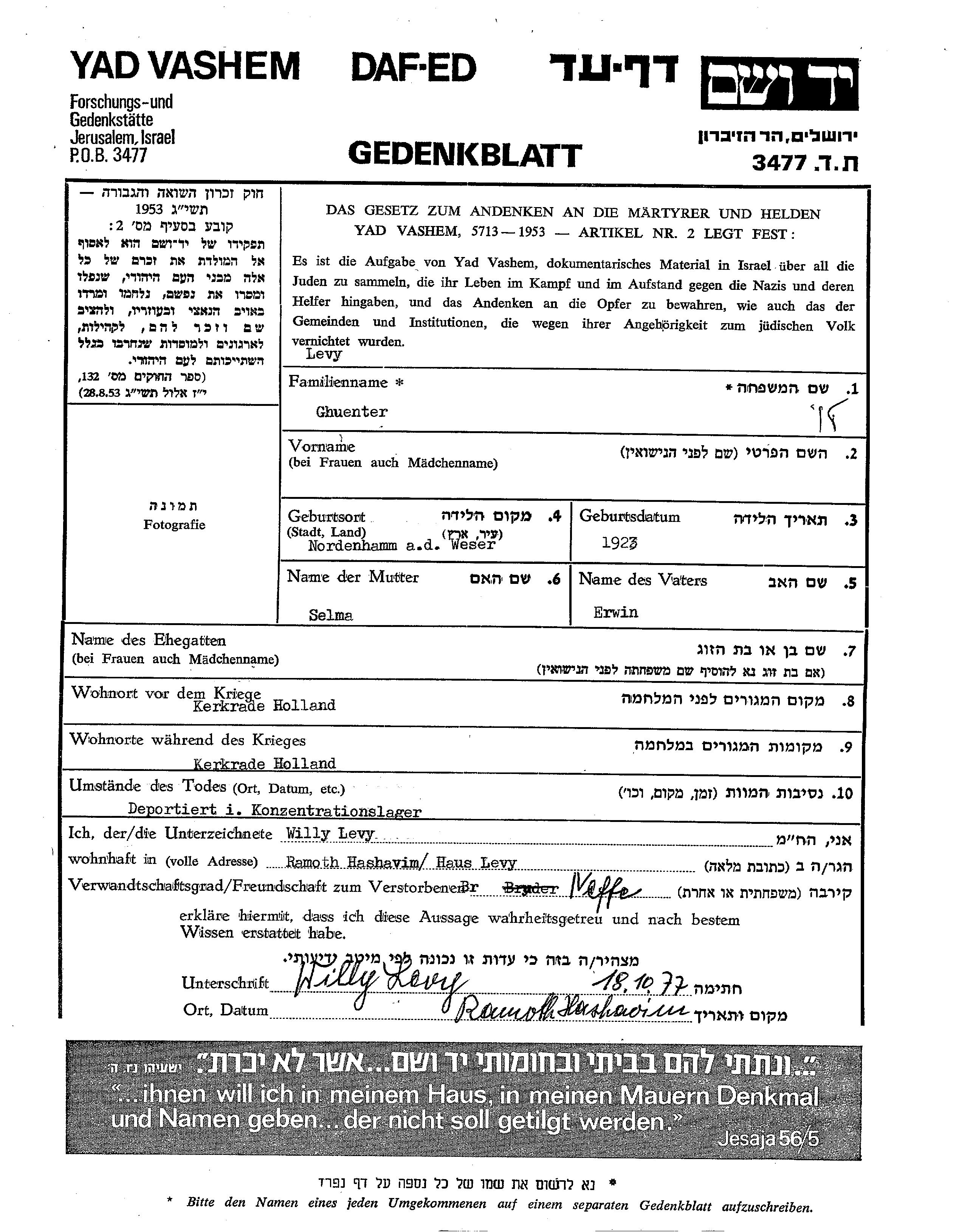 Vorname unbekannt Levy wurde im Jahr 1923 in Nordenham, Deutsches Reich geboren. Er war der Sohn von Erwin und Selma. Vor dem Zweiten Weltkrieg lebte er in Kerkrade, Niederlande. Während des Krieges war er in Kerkrade, Niederlande.
