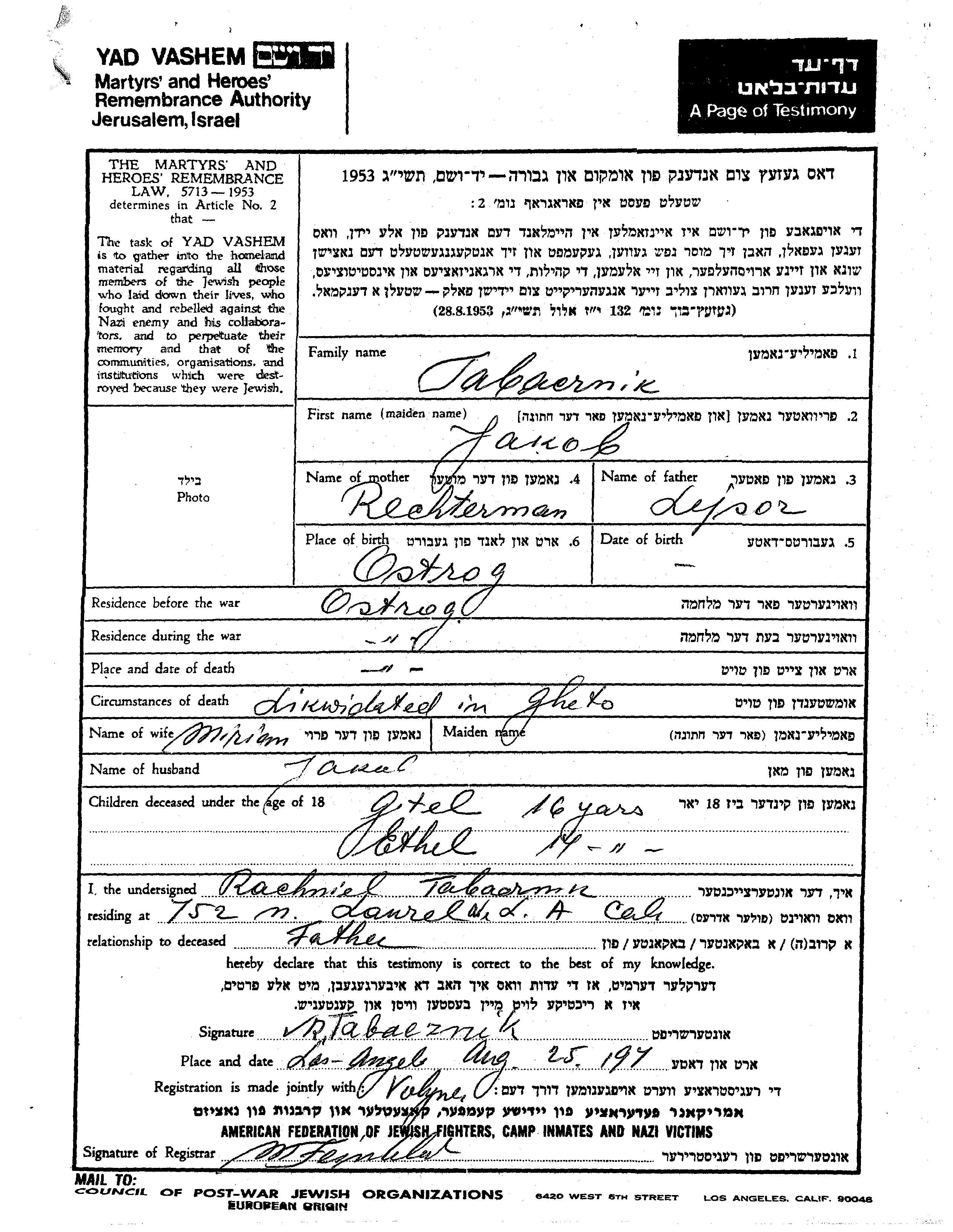 Yakob wurde in der Schoah ermordet. Todesort: Ostrog, Polen.