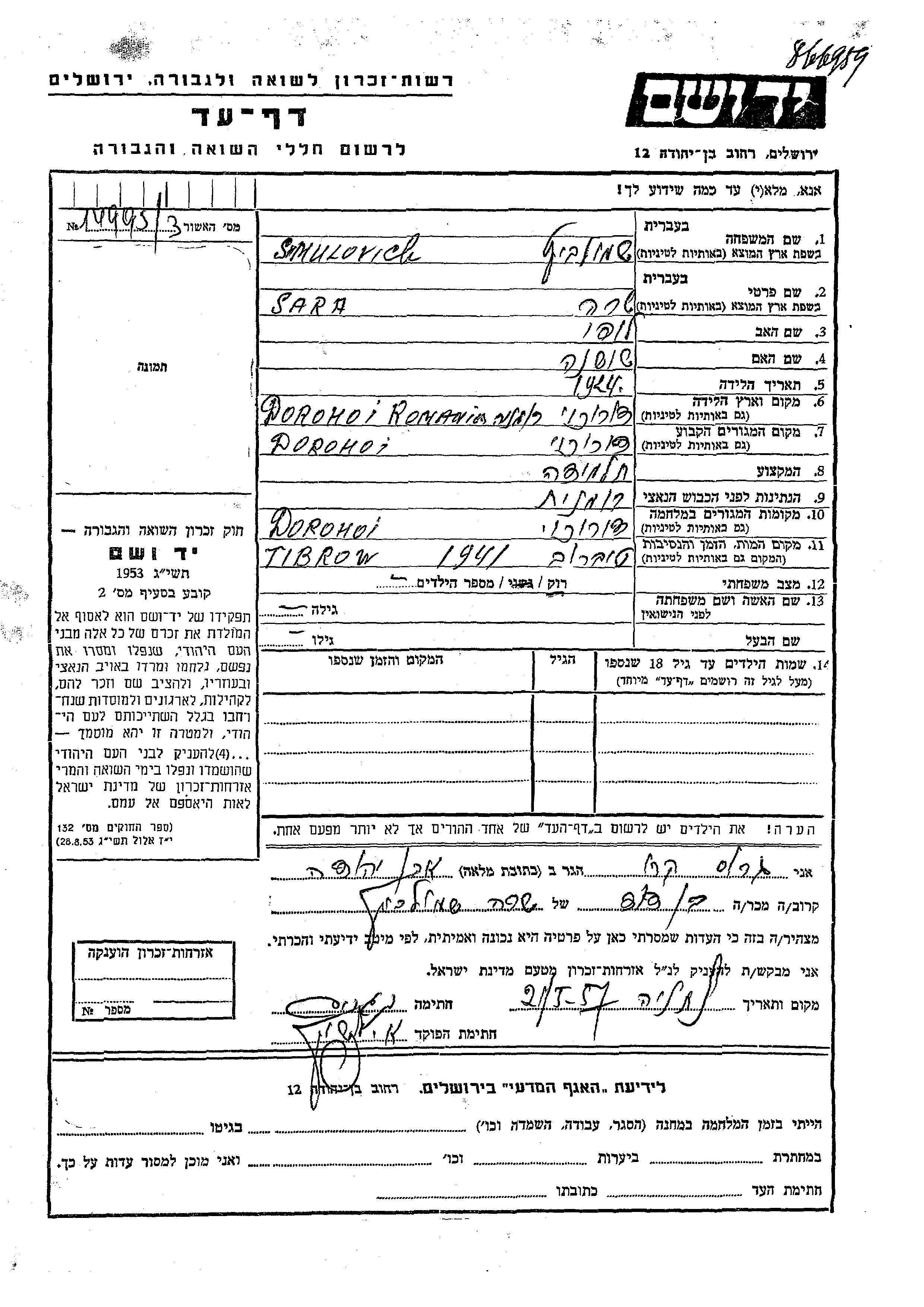 Shmulovich Sara 1924 Dorohoi, Rumänien Gedenkblatt