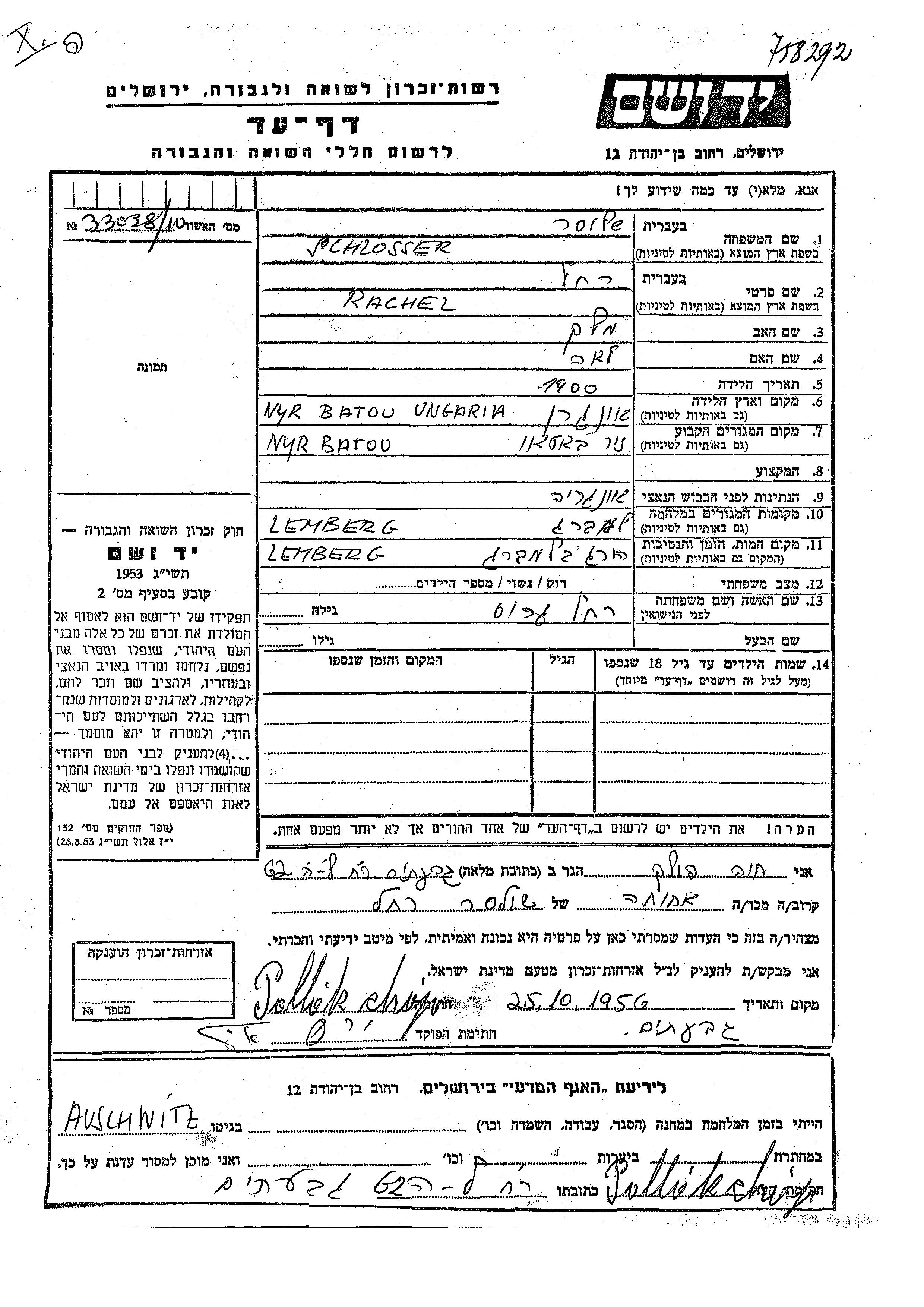 Rachel Schlosser, geb. Gros wurde im Jahr 1900 in Nyirbator, Ungarn geboren. Sie war die Tochter von Melekh und Lea. Sie war mit Rakhel Verheiratet. Vor dem Zweiten Weltkrieg lebte sie in Nyirbator, Ungarn. Während des Krieges war sie in Lemberg, Polen.