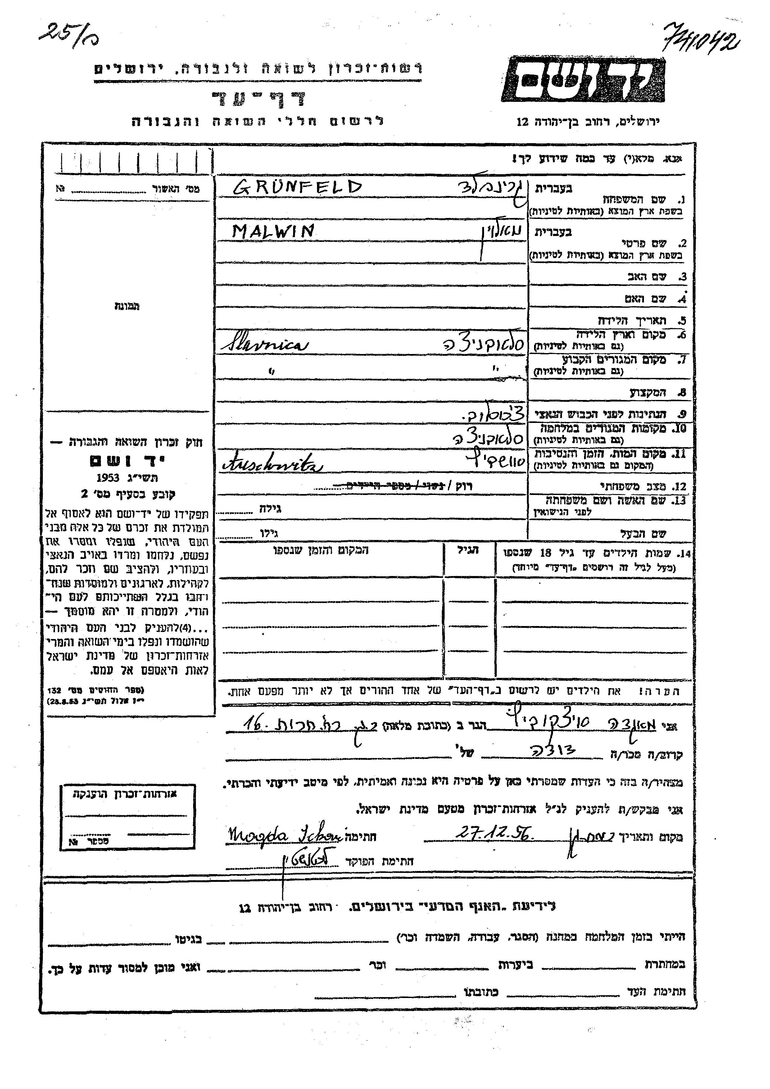 Malwin Grunfeld wurde in Slavnica, Tschechoslowakei geboren. Sie war Ledig. Vor dem Zweiten Weltkrieg lebte sie in Slavnica, Tschechoslowakei. Während des Krieges war sie in Slavnica, Tschechoslowakei.