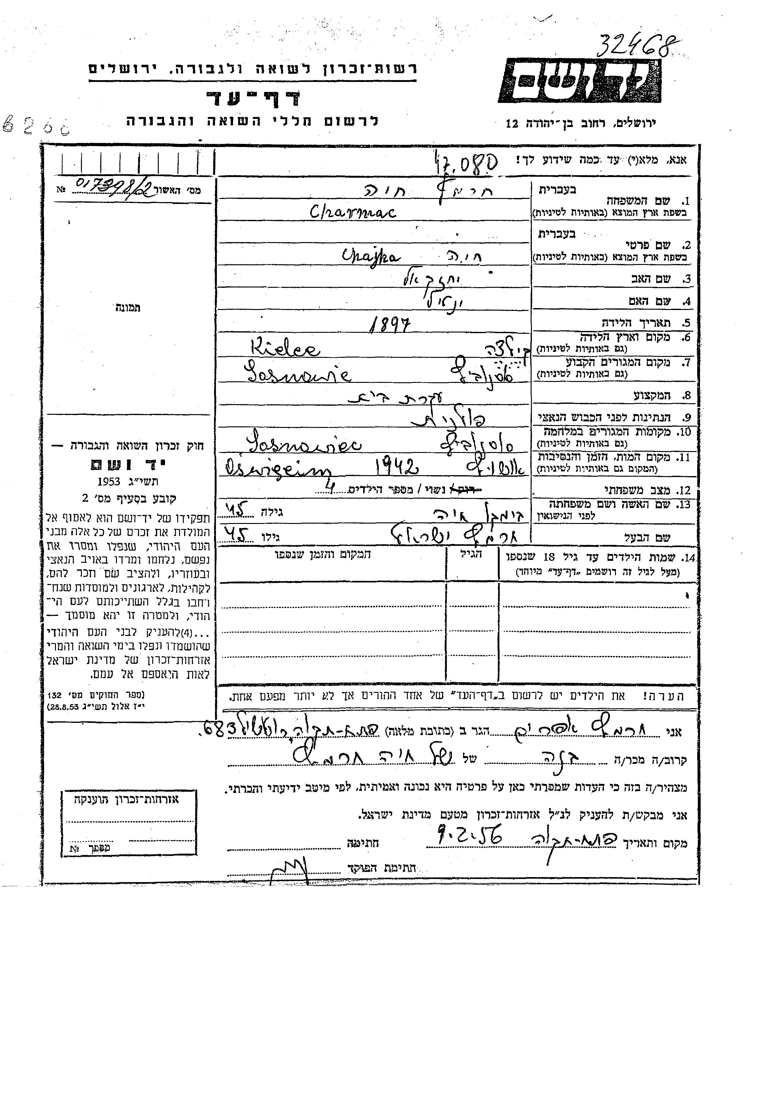 Chajka Charmac, geb. Bimka wurde im Jahr 1897 in Kelce, Polen geboren. Sie war die Tochter von Yekhezkel und Ientil. Sie war Hausfrau und mit Yisrael Verheiratet. Vor dem Zweiten Weltkrieg lebte sie in Sosnovice, Polen. Während des Krieges war sie in Sosnovice, Polen.
