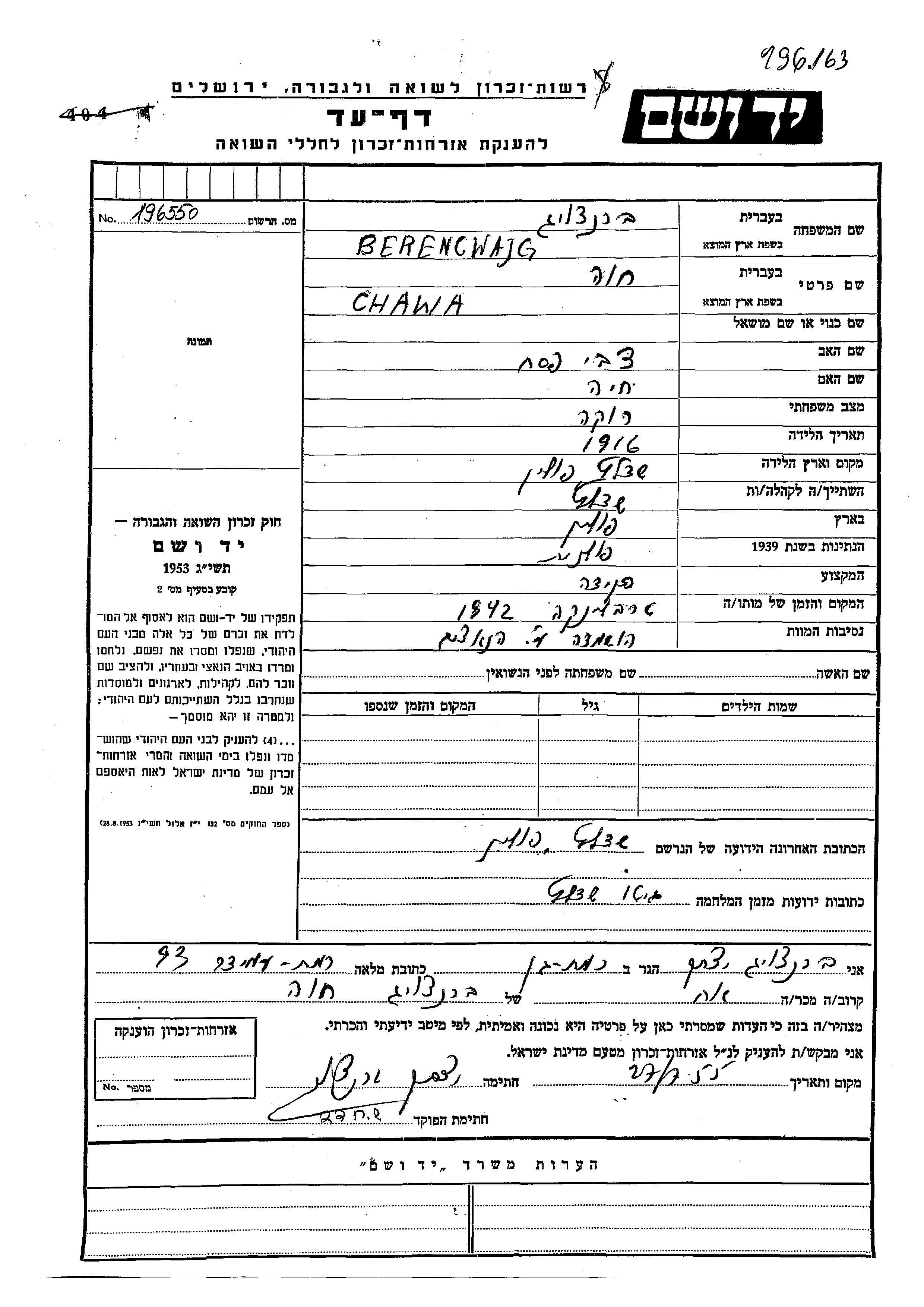 Chawa Berencwajg wurde im Jahr 1916 in Siedlce, Polen geboren. Sie war die Tochter von Tzvi Pesakh und Khaia. Sie war Angestellte/-r und Ledig. Vor dem Zweiten Weltkrieg lebte sie in Siedlce, Polen. Während des Krieges war sie in Siedlce, Polen.