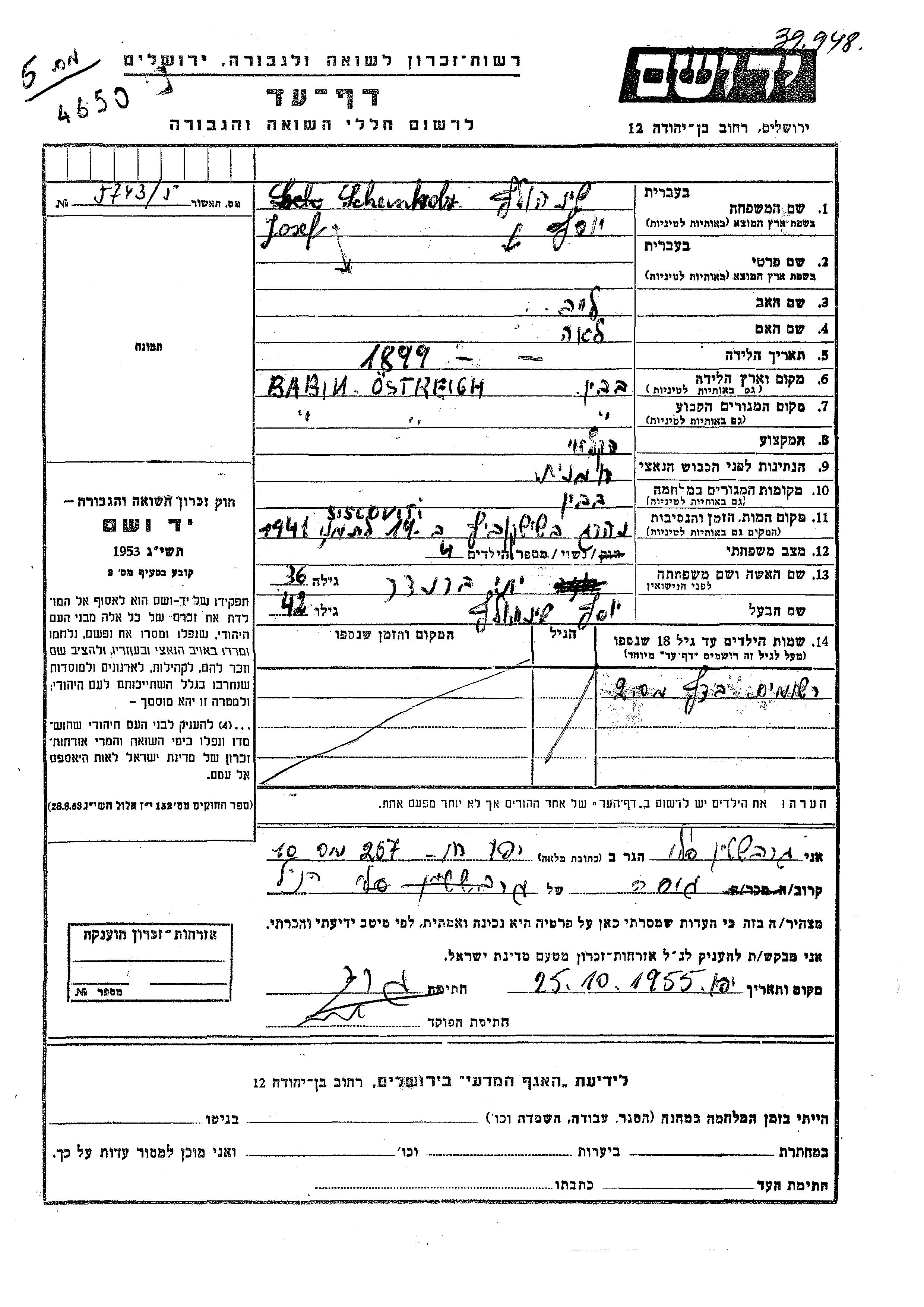Josef Scheinholz wurde im Jahr 1899 in Babin, Rumänien geboren. Er war der Sohn von Leib und Lea. Er war Landwirt und mit Yehudit, geb. Brander Verheiratet. Vor dem Zweiten Weltkrieg lebte er in Babin, Rumänien. Während des Krieges war er in Babin, Rumänien.