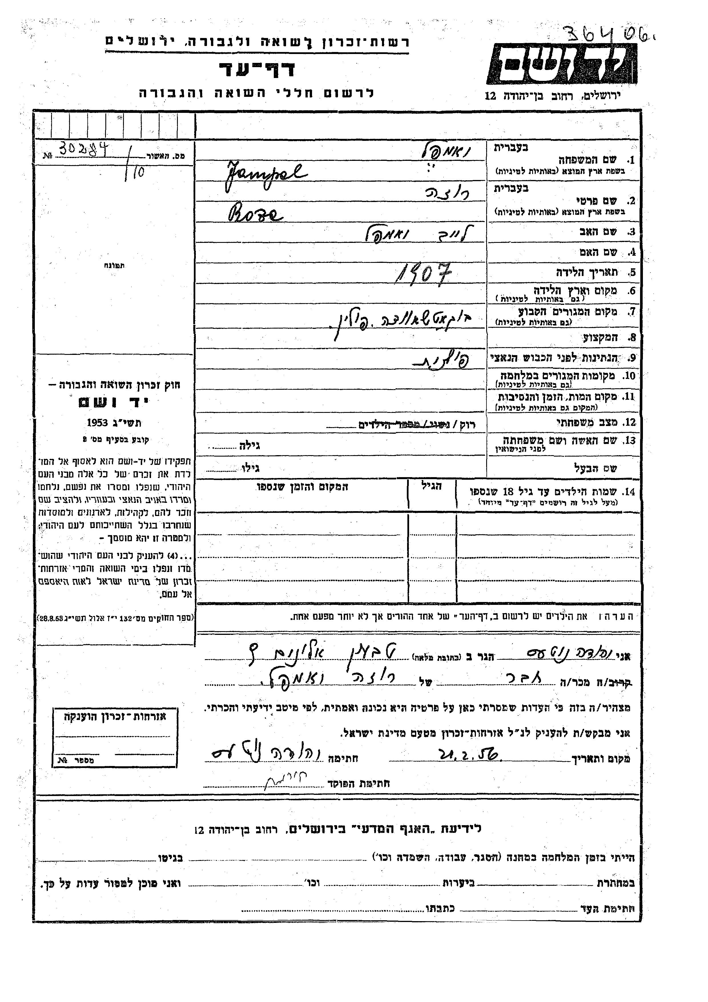Roza Jampel wurde im Jahr 1907 geboren. Sie war die Tochter von Leib. Sie war Ledig. Vor dem Zweiten Weltkrieg lebte sie in Bukaczowce, Polen.