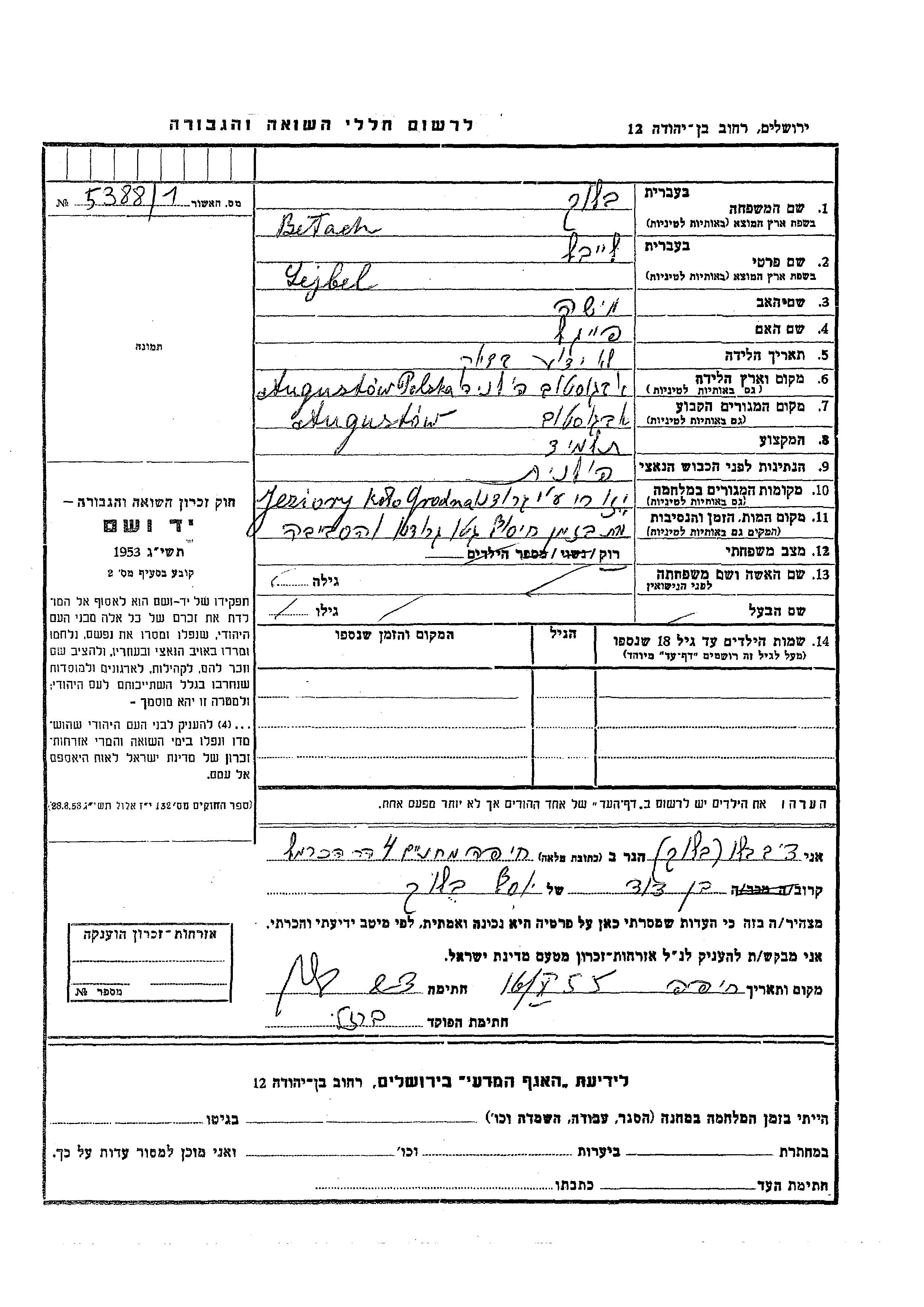 Lejbel Belach wurde in Augustów, Polen geboren. Er war der Sohn von Misha und Feigel. Er war Schüler/-in und Ledig. Vor dem Zweiten Weltkrieg lebte er in Augustów, Polen. Während des Krieges war er in Jeziory, Polen.