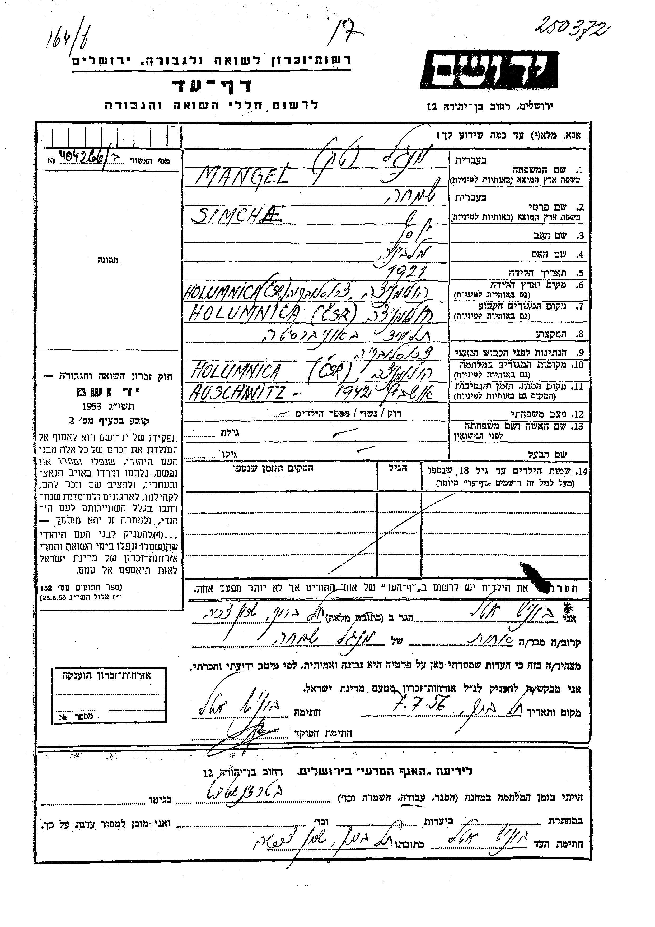 Simche Mangel Tak wurde im Jahr 1921 in Holumnica, Tschechoslowakei geboren. Er war der Sohn von Yosef und Malvina. Er war Student. Vor dem Zweiten Weltkrieg lebte er in Holumnica, Tschechoslowakei. Während des Krieges war er in Holumnica, Tschechoslowakei.