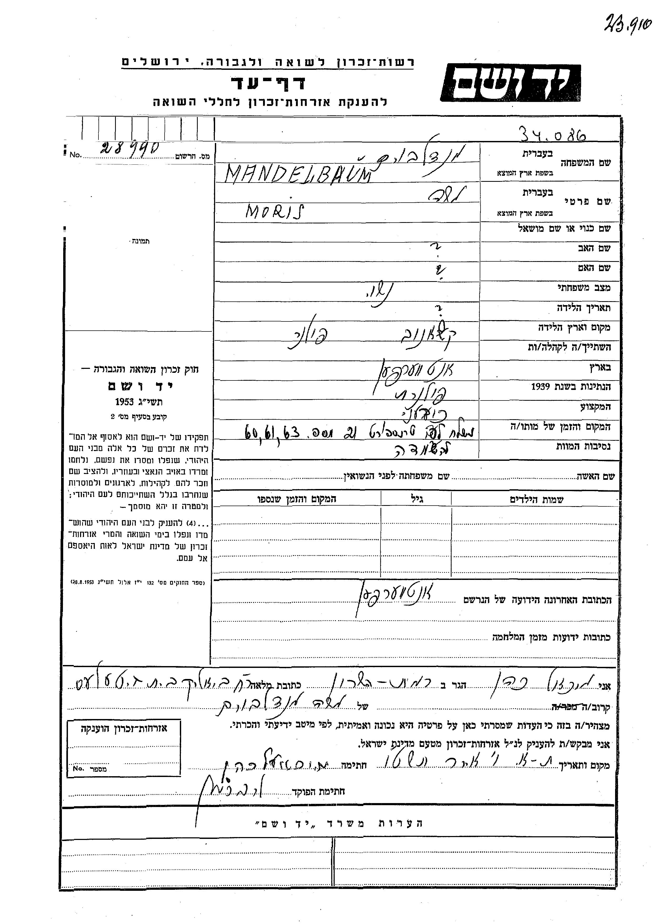Mandelbaum Moris Moshe unbekannter Ort, Gedenkblatt