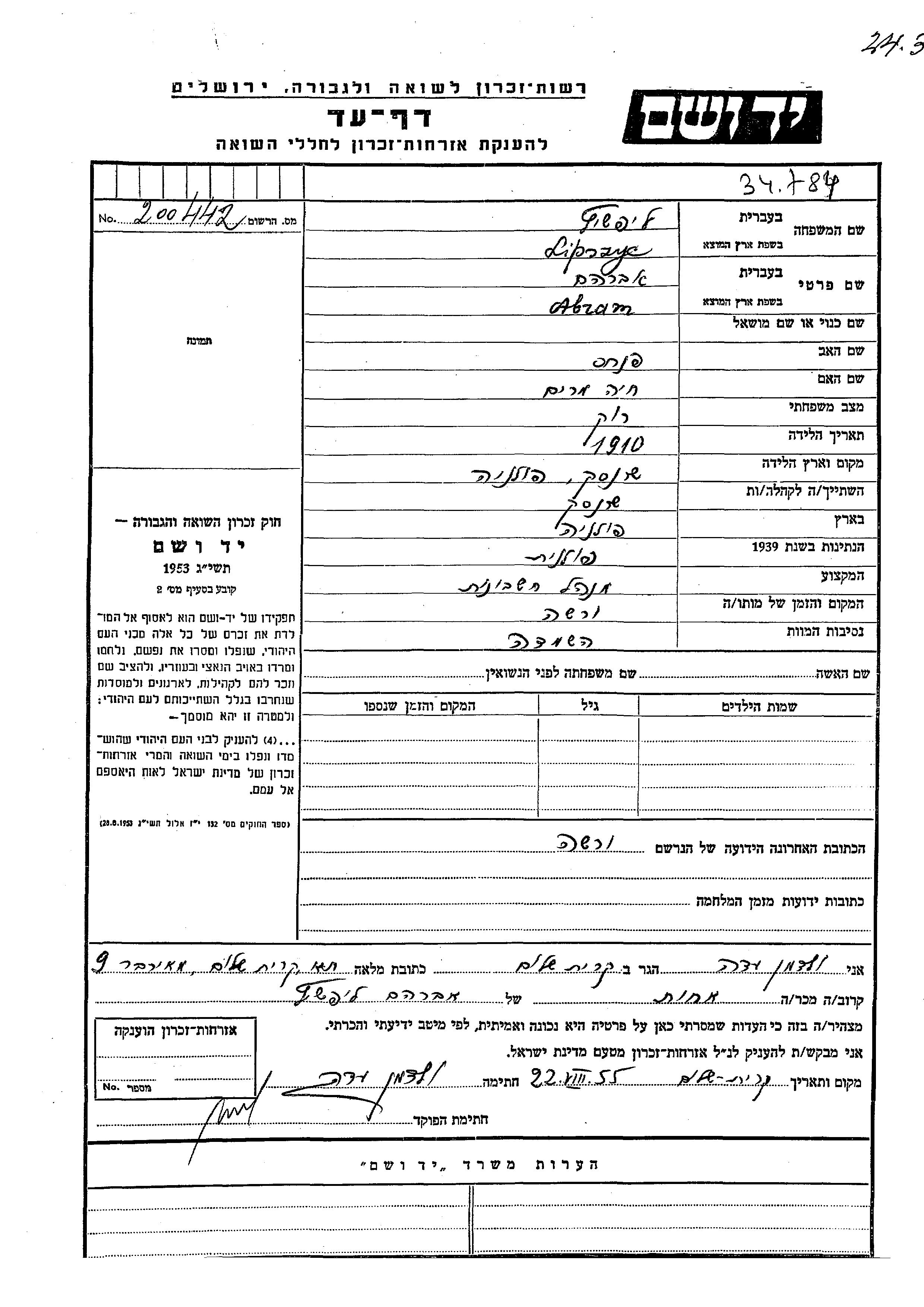 Abram Lipszyc wurde im Jahr 1910 in Szrensk, Polen geboren. Er war der Sohn von Pinkhas und Khaia Miriam. Er war Buchhalter/-in und Ledig. Vor dem Zweiten Weltkrieg lebte er in Varsha, Polen.
