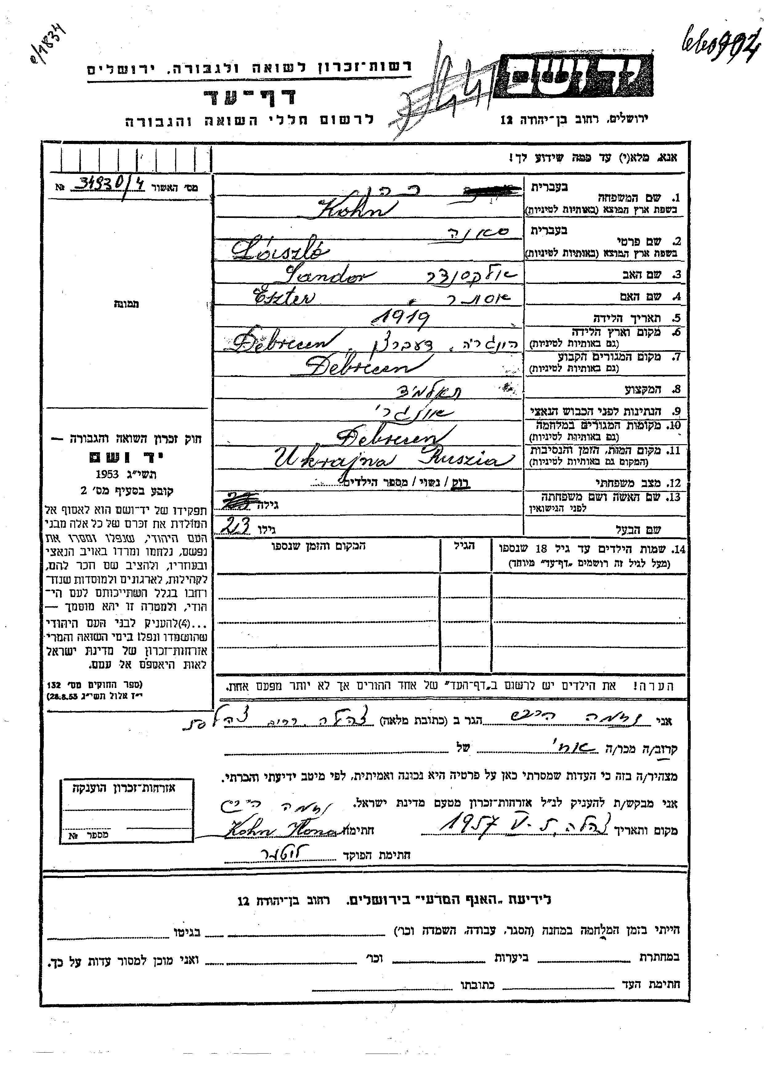 Laszlo Natanel Kohn wurde im Jahr 1919 in Debrecen, Ungarn geboren. Er war der Sohn von Sandor und Eszter. Er war Schüler/-in und Ledig. Vor dem Zweiten Weltkrieg lebte er in Debrecen, Ungarn. Während des Krieges war er in Debrecen, Ungarn.