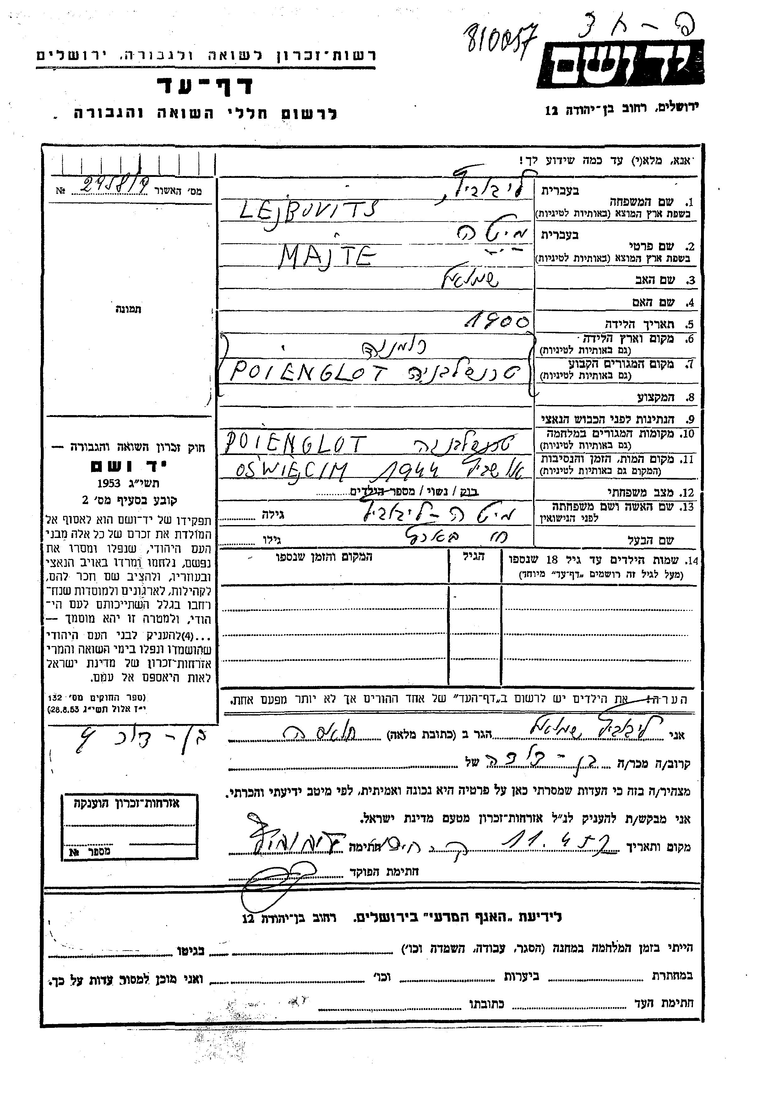 Majte Lejbovits wurde im Jahr 1900 in Poienile Glod, Rumänien geboren. Sie war die Tochter von Shmuel. Sie war Verheiratet. Vor dem Zweiten Weltkrieg lebte sie in Poienile Glod, Rumänien. Während des Krieges war sie in Poienile Glod, Rumänien.