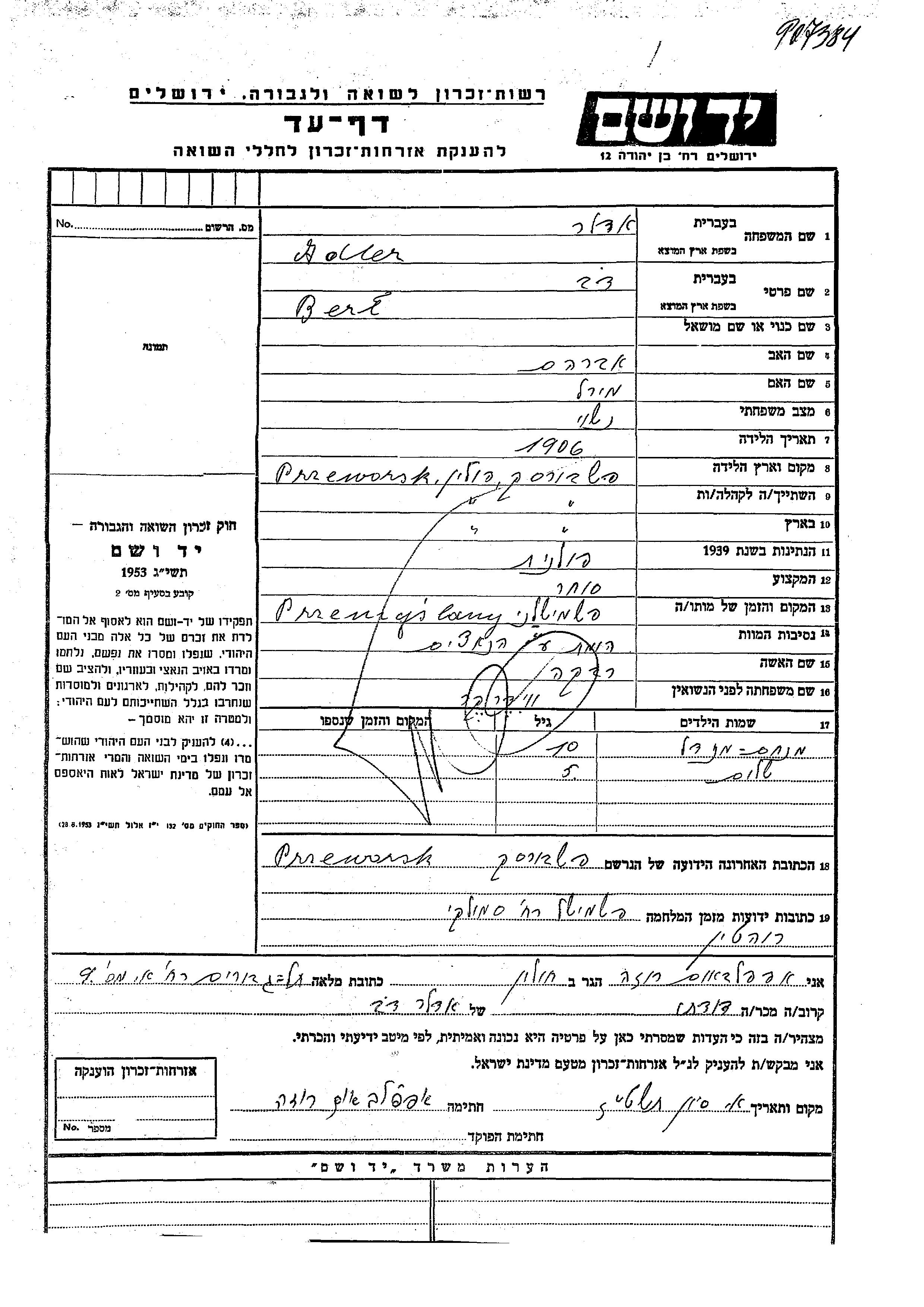 Berl Dov Adler wurde im Jahr 1906 in Przeworsk, Polen geboren. Er war der Sohn von Avraham und Mirl. Er war Kaufmann/-frau und mit Rivka, geb. Viderker Verheiratet. Vor dem Zweiten Weltkrieg lebte er in Przeworsk, Polen. Während des Krieges war er in Przemyslany, Polen.