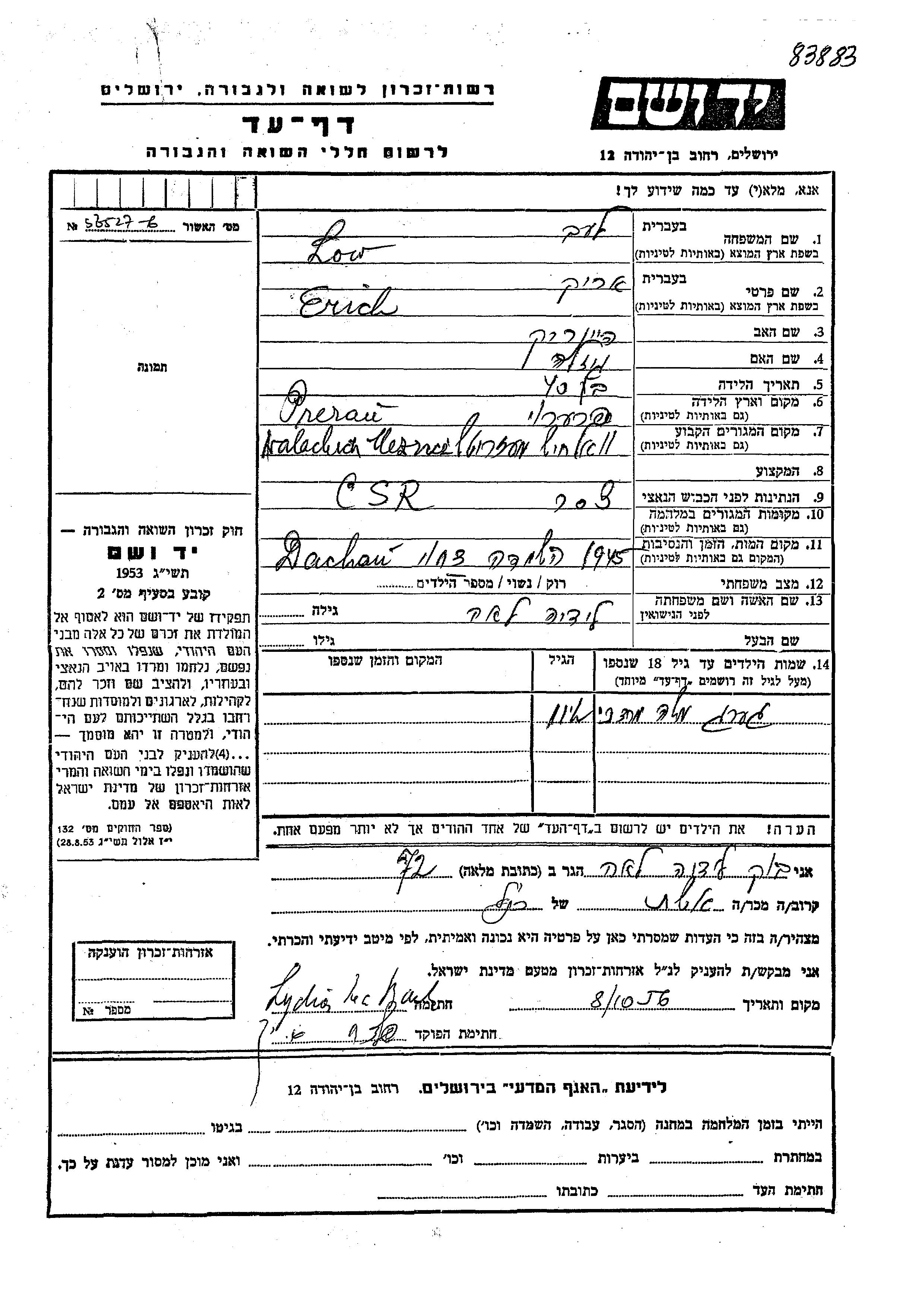 Erich Low wurde in Prerau, Tschechoslowakei geboren. Er war der Sohn von Henrik und Gizela. Er war mit Lidia Lea Verheiratet. Vor dem Zweiten Weltkrieg lebte er in Valasske Mezirici, Tschechoslowakei.