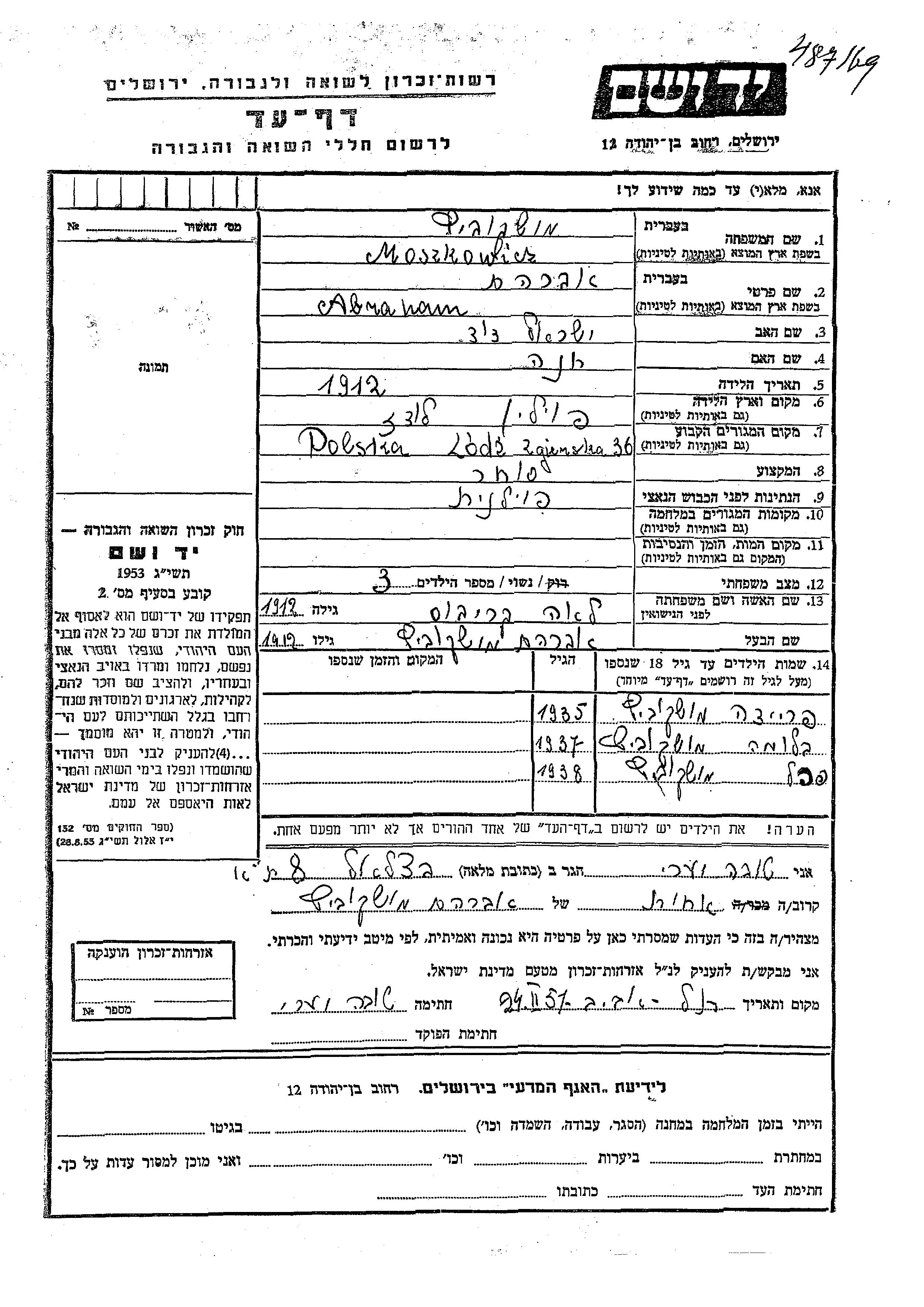 Abraham Moszkowicz wurde im Jahr 1912 in Lodz, Polen geboren. Er war der Sohn von Yisrael David und Khana. Er war Kaufmann/-frau und mit Lea, geb. Kribus Verheiratet. Vor dem Zweiten Weltkrieg lebte er in Lodz, Polen.
