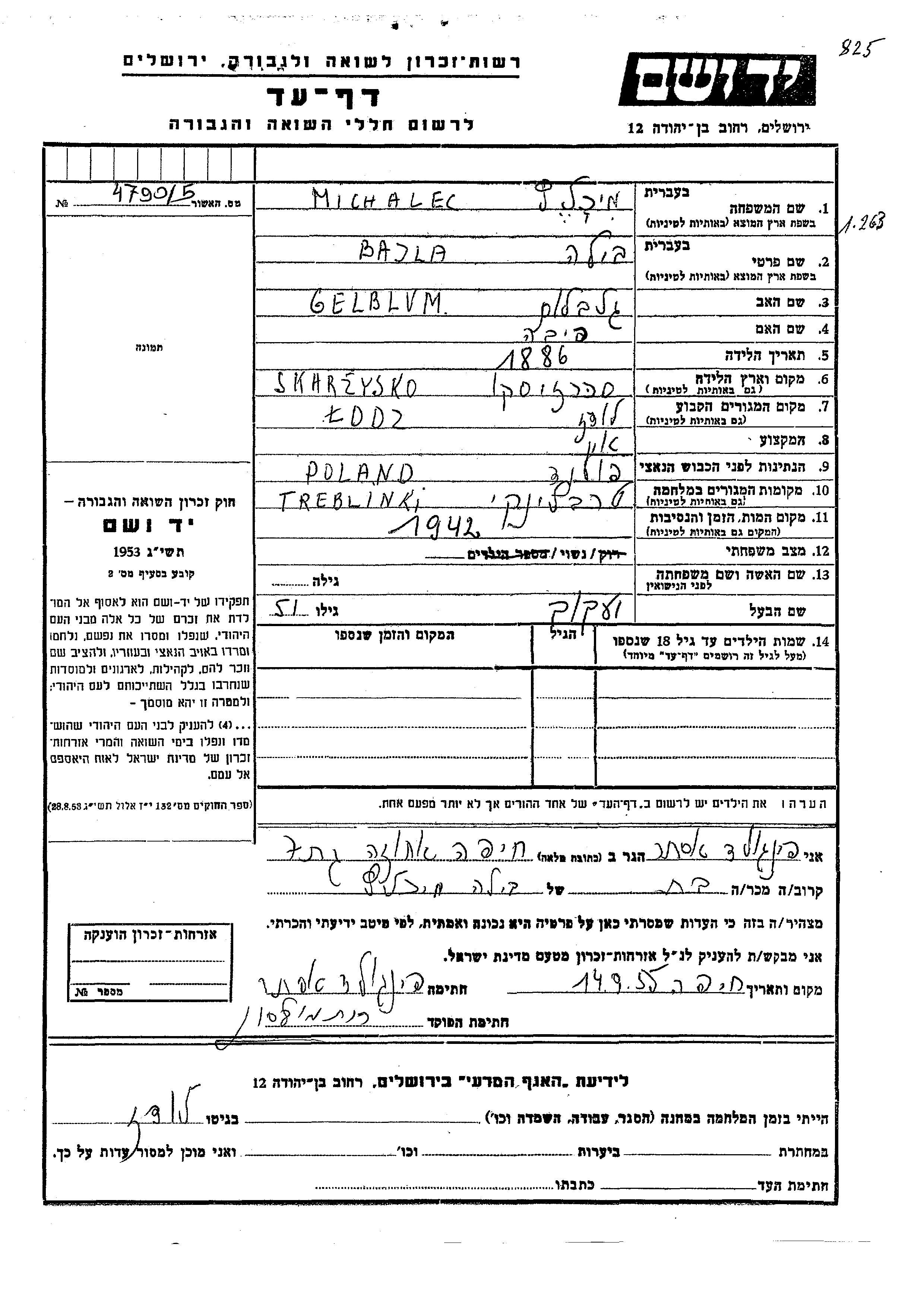 Bajla Michalec, geb. Gelblum wurde im Jahr 1886 in Skarzysko, Polen geboren. Sie war die Tochter von Feibush. Sie war mit Yaakov Verheiratet. Vor dem Zweiten Weltkrieg lebte sie in Lodz, Polen. Während des Krieges war sie in Treblinka, Polen.