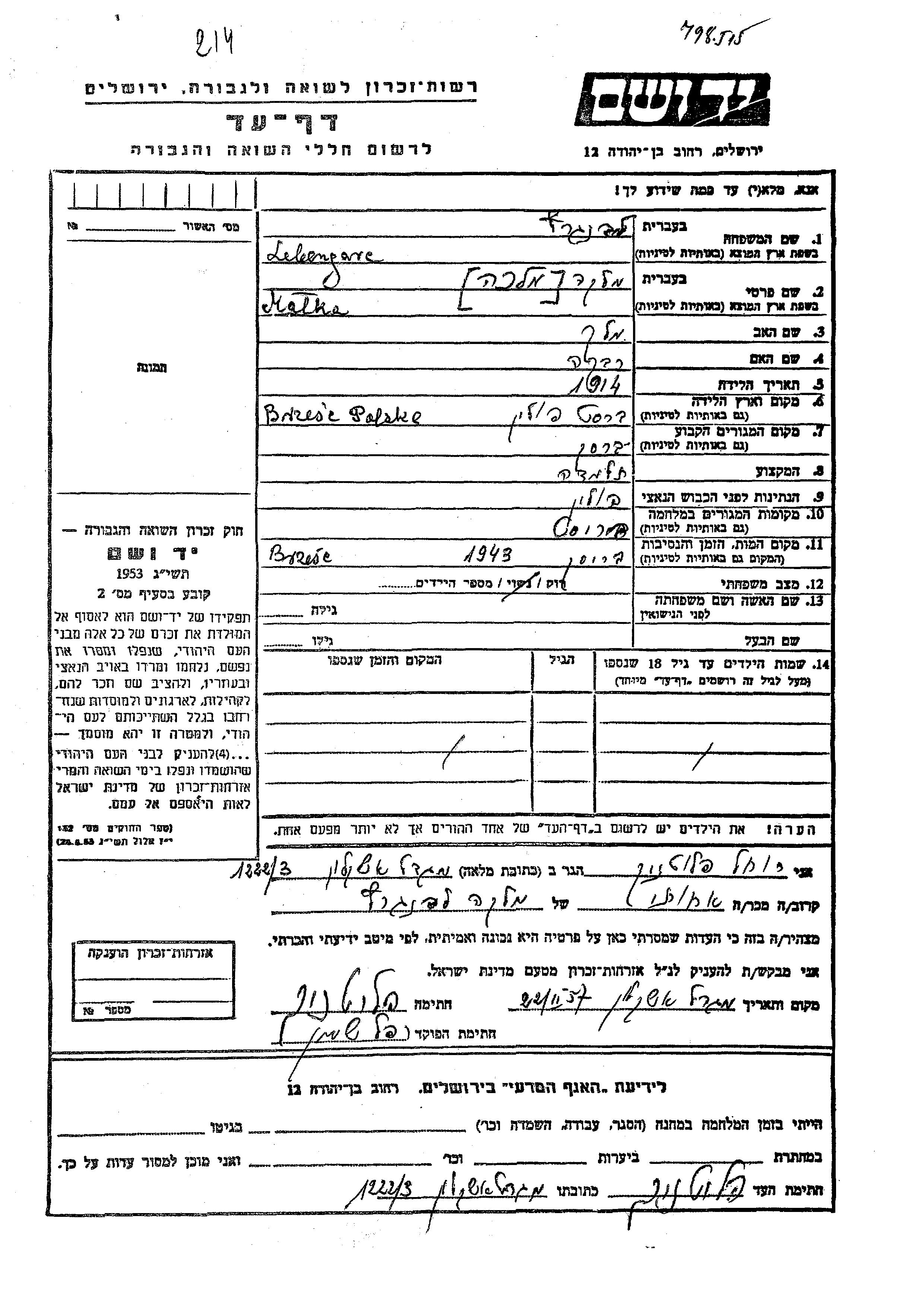 Malka Lebengarc wurde im Jahr 1914 in Brzesc, Polen geboren. Sie war die Tochter von Melekh und Rivka. Sie war Schüler/-in und Ledig. Vor dem Zweiten Weltkrieg lebte sie in Brzesc, Polen.
