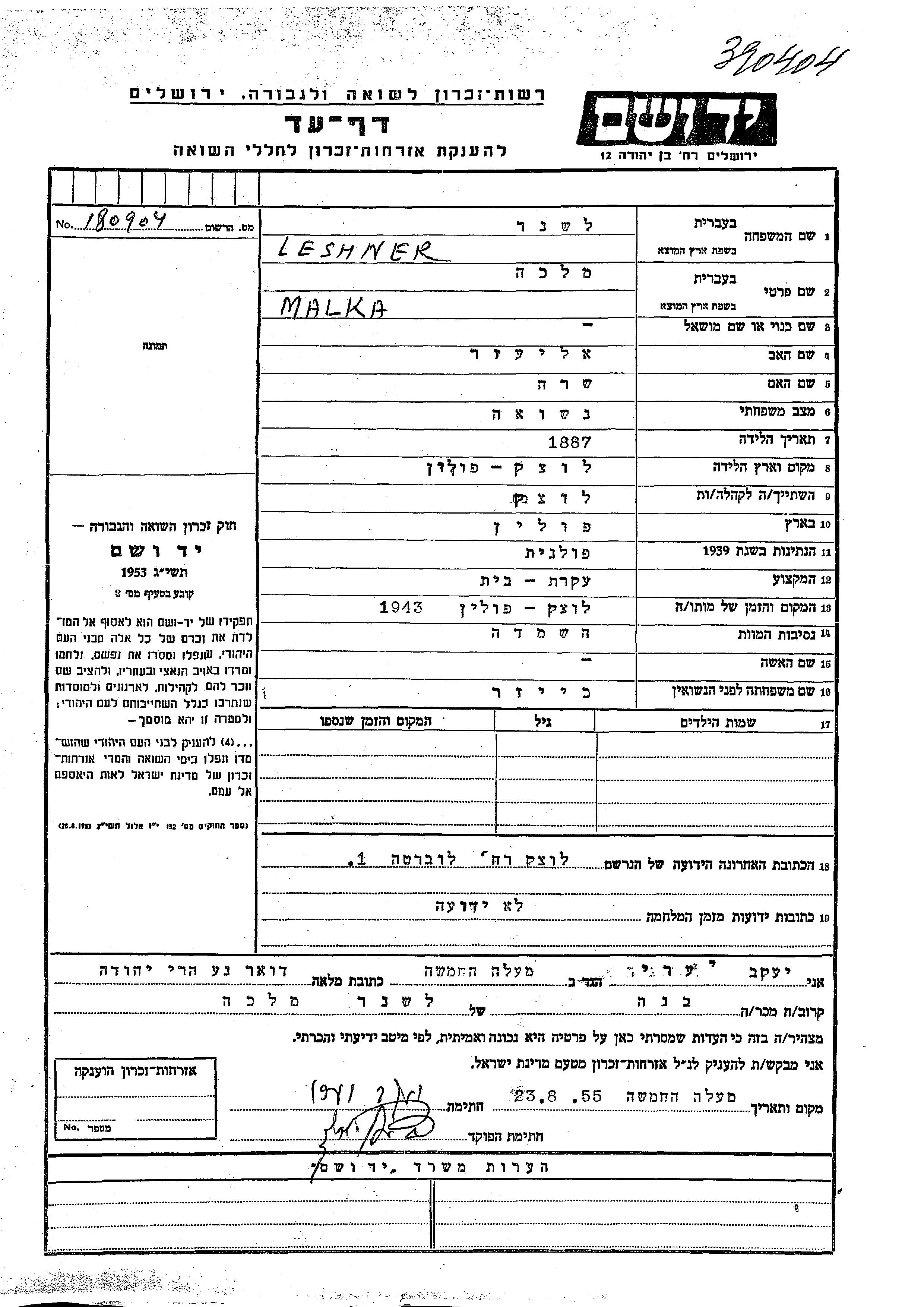 Malka Leshner, geb. Keizer wurde im Jahr 1887 in Luck, Polen geboren. Sie war die Tochter von Eliezer und Sara. Sie war Hausfrau und Verheiratet. Vor dem Zweiten Weltkrieg lebte sie in Luck, Polen. Während des Krieges war sie in Luck, Polen.