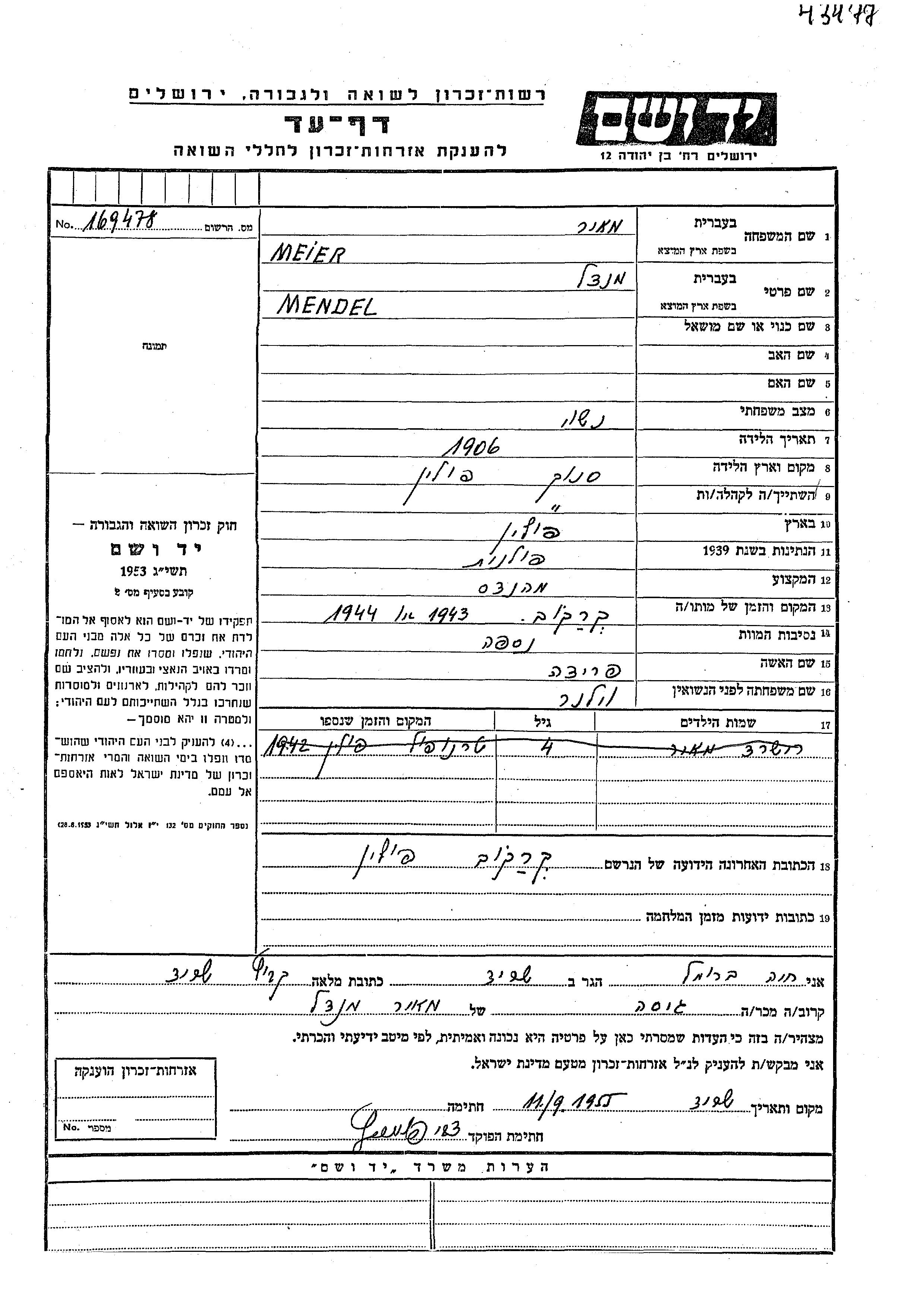 Mendel Meier wurde im Jahr 1906 in Sanok, Polen geboren. Er war Ingenieur und mit Frida, geb. Vilner Verheiratet. Vor dem Zweiten Weltkrieg lebte er in Krakow, Polen.
