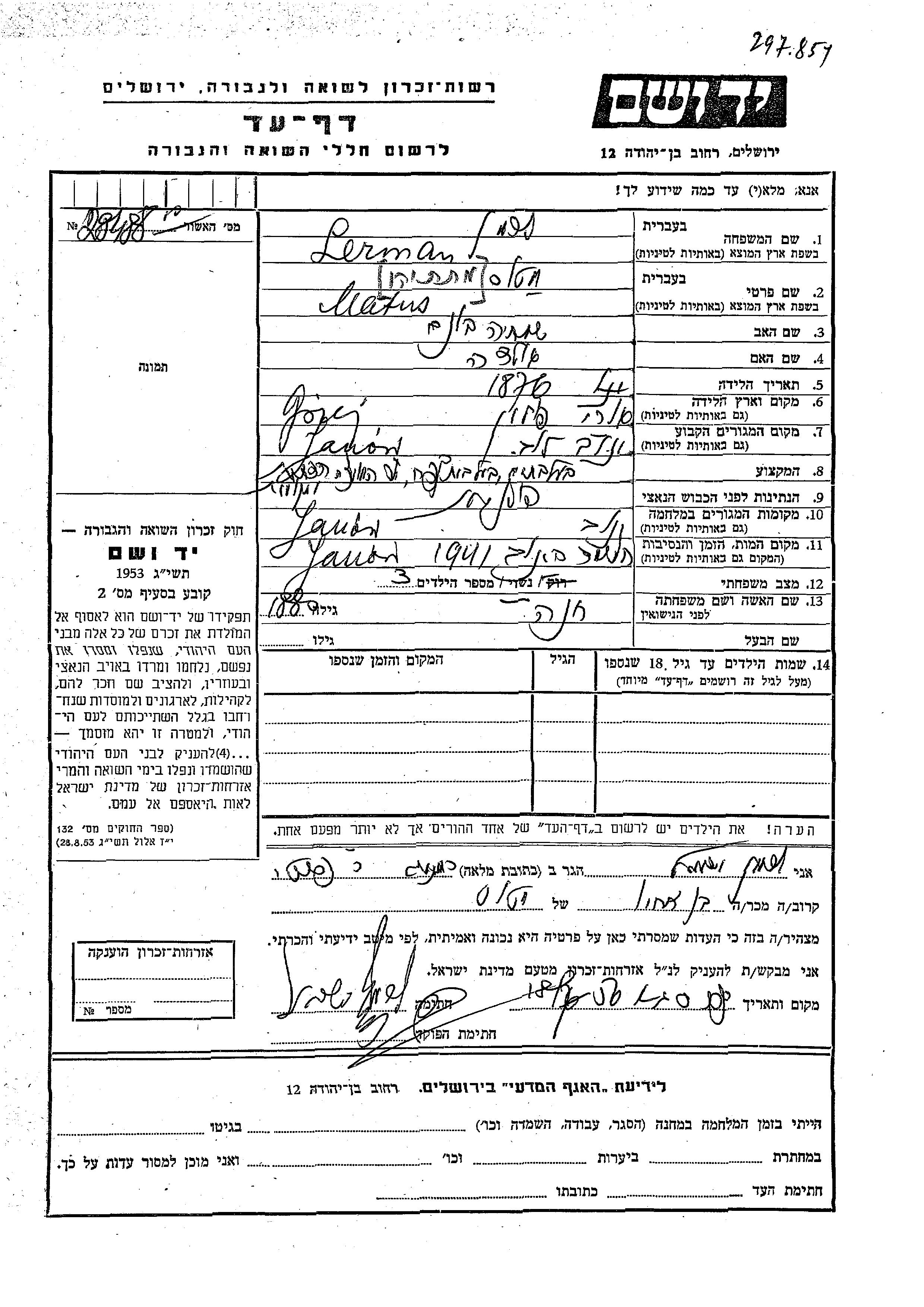 Matus Matatiahu Lerman wurde im Jahr 1876 in Goraj, Polen geboren. Er war der Sohn von Simkha Bunem und Golda. Er war Hausbesitzer und mit Khana Verheiratet. Vor dem Zweiten Weltkrieg lebte er in Janow, Polen. Während des Krieges war er in Janow, Polen.