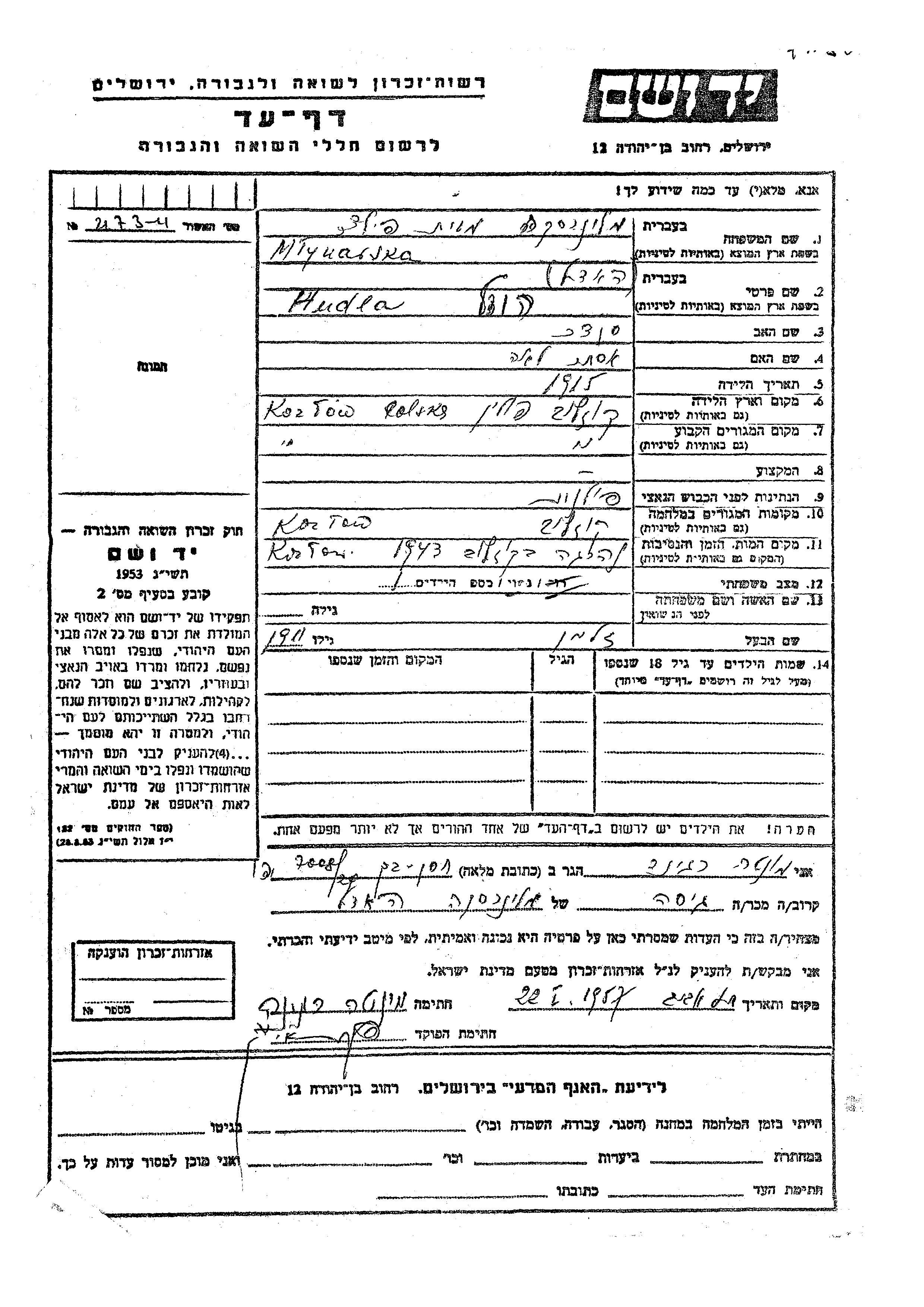Hudla wurde in der Schoah ermordet. Todesort: Kozlow, Polen im Jahr 1943.