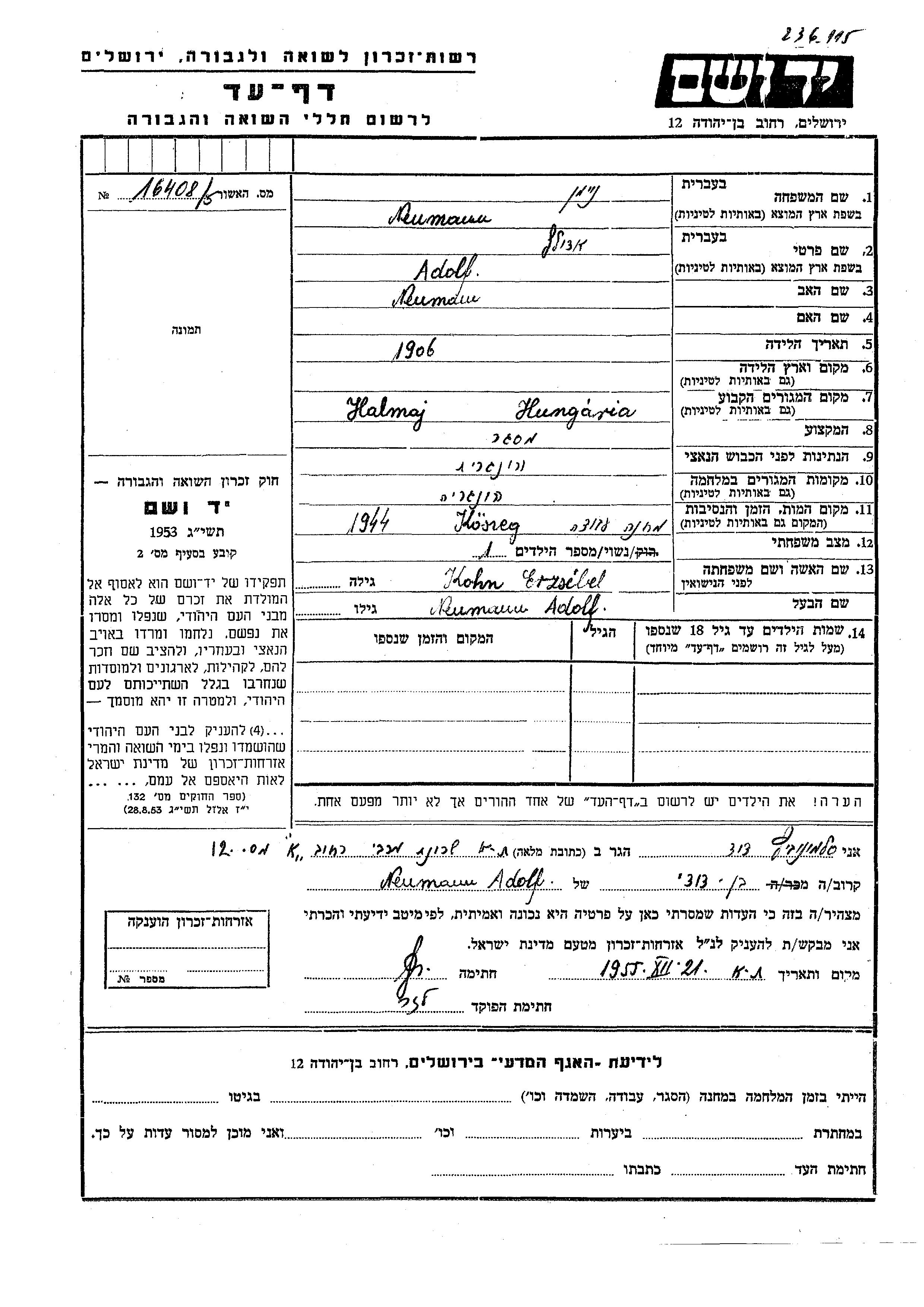 Adolf Neumann wurde im Jahr 1906 geboren. Er war Schlosser und mit Erzsebet, geb. Kohn Verheiratet. Vor dem Zweiten Weltkrieg lebte er in Halmaj, Ungarn. Während des Krieges war er in Ungarn.