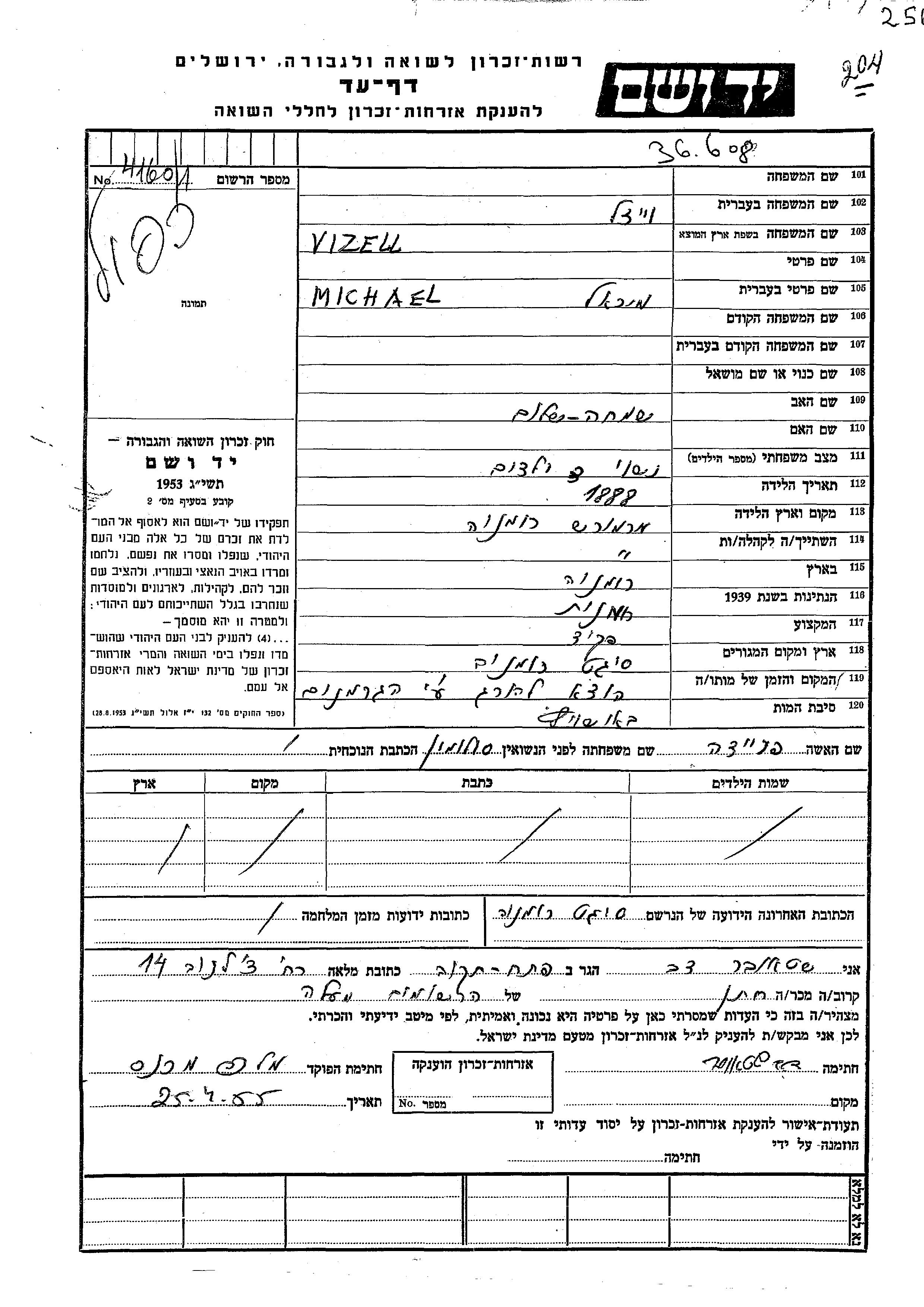 Michael Vizell wurde im Jahr 1888 in Maramures, Rumänien geboren. Er war der Sohn von Simkha Shalom. Er war Angestellte/-r und mit Freida, geb. Solomon Verheiratet. Vor dem Zweiten Weltkrieg lebte er in Siget, Rumänien. Während des Krieges war er in Siget, Rumänien.
