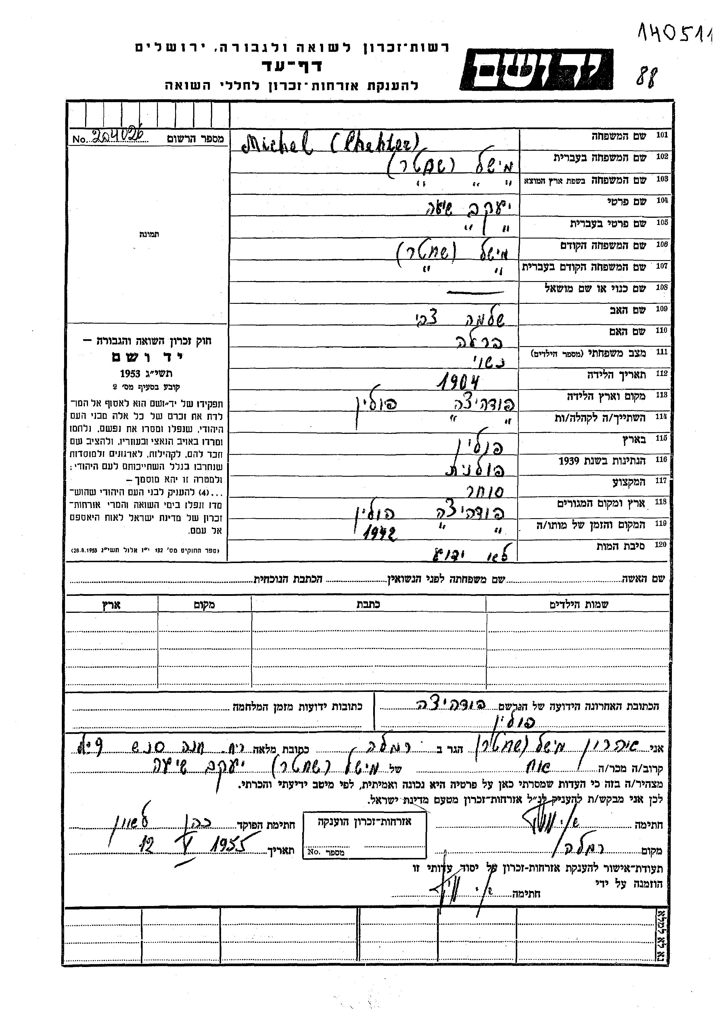 Yaakov Shiye Michel Chehter Mishel wurde im Jahr 1904 in Podhajce, Polen geboren. Er war der Sohn von Shlomo Tzvi und Perla. Er war Kaufmann/-frau und Verheiratet.