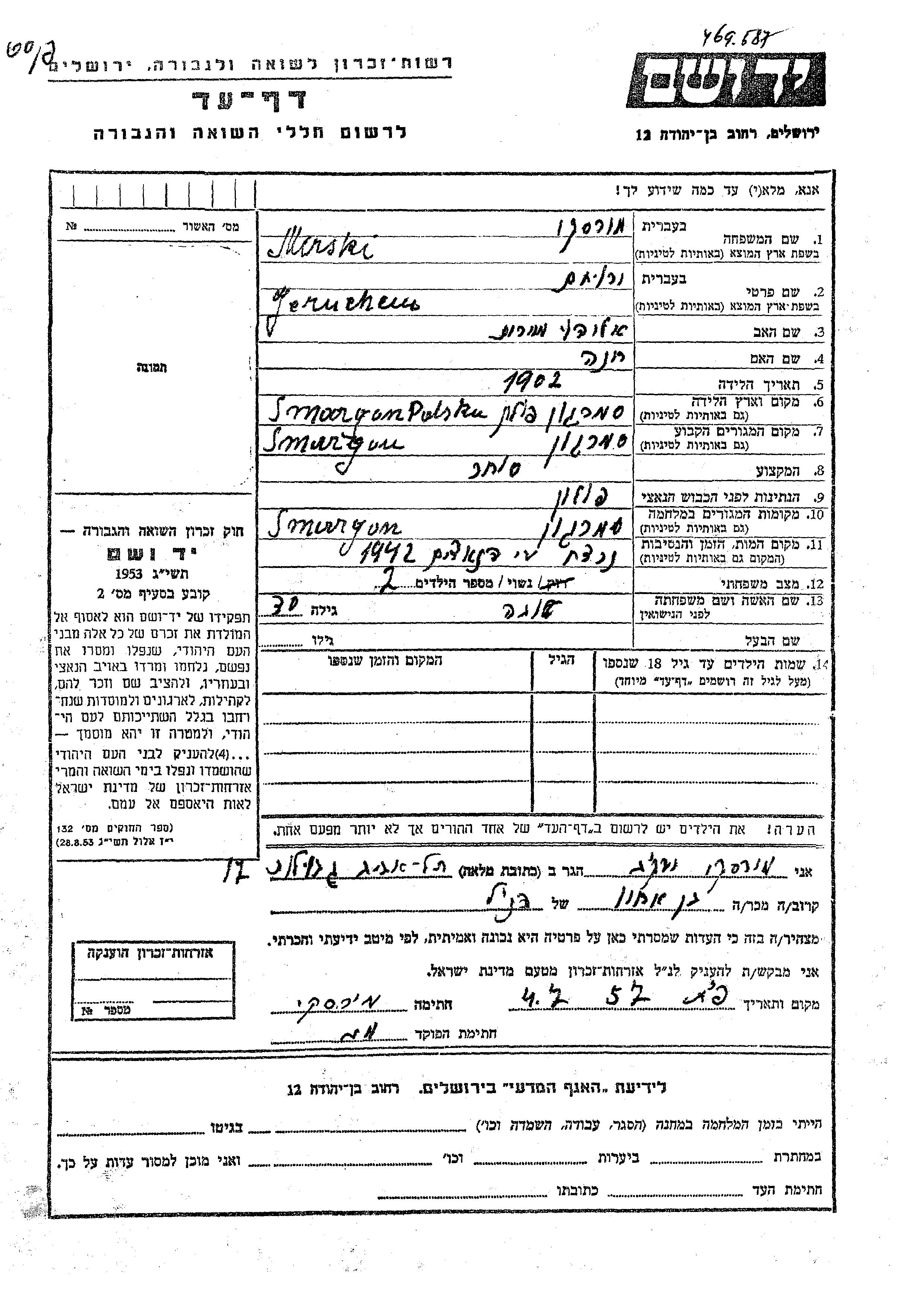 Jeruchem Murski wurde im Jahr 1902 in Smargon, Polen geboren. Er war der Sohn von Mairim Eliahu und Khana. Er war Kaufmann/-frau und mit Tova Verheiratet. Vor dem Zweiten Weltkrieg lebte er in Smargon, Polen. Während des Krieges war er in Smargon, Polen.