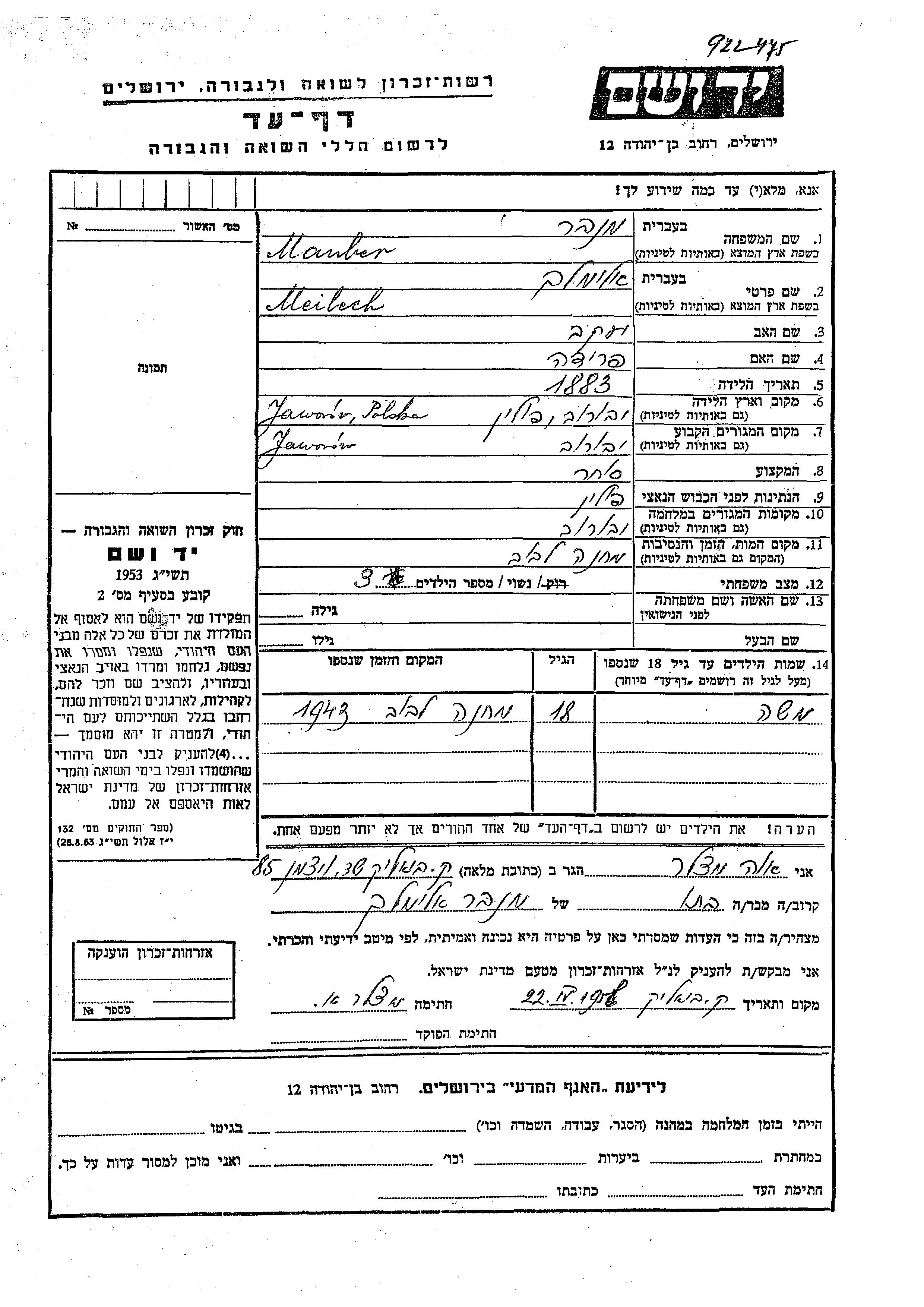 Meilech Elimelekh Manber wurde im Jahr 1883 in Jaworow, Polen geboren. Er war der Sohn von Yaakov und Frida. Er war Kaufmann/-frau und Verheiratet. Vor dem Zweiten Weltkrieg lebte er in Jaworow, Polen. Während des Krieges war er in Jaworow, Polen.